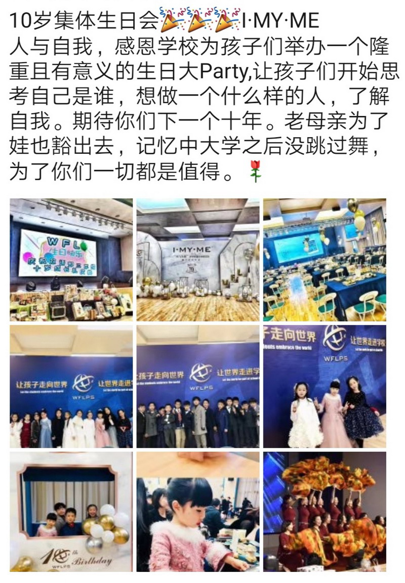 生日會上,共同回憶了孩子們三年來在WFL的點滴進步,共同見證了孩子們在主題式探究活動中的成長!三年級爸爸代表發言,表達了對孩子們的祝福并送上了一首《真心英雄》。
