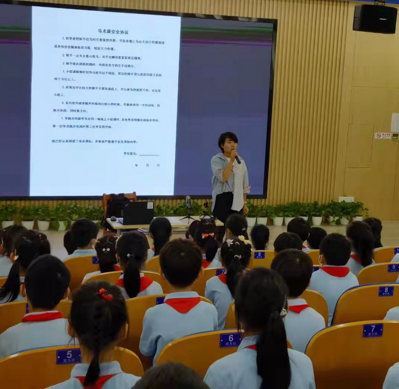 通過簽署安全協議,觀看視頻,同學們明確了進入馬場的要求和注意事項。他們還了解了馬的品種、習性、各身體部位的作用及喂養方式,為和馬兒進一步的親密接觸打下堅實的理論基礎。