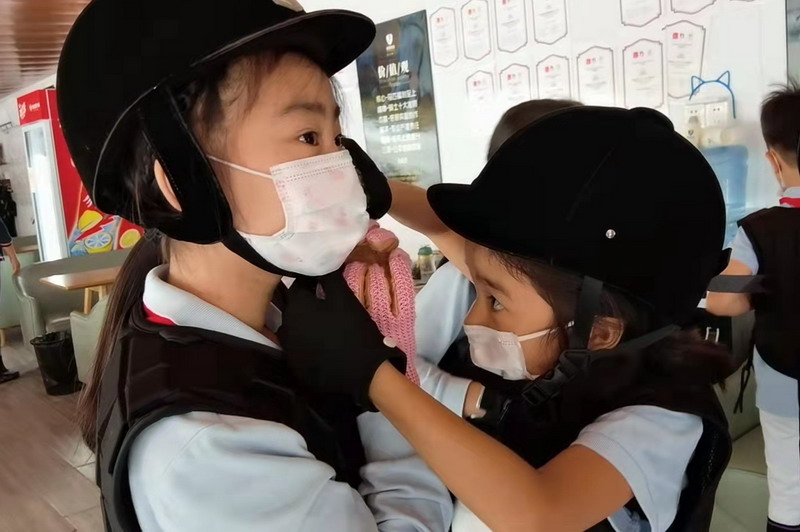 上馬前同學們還要學習護具的穿戴,護具可以很好地保護我們的身體,這一步千萬不能少。Before riding the horse, they should wear the right equipment, which will protect themselves.