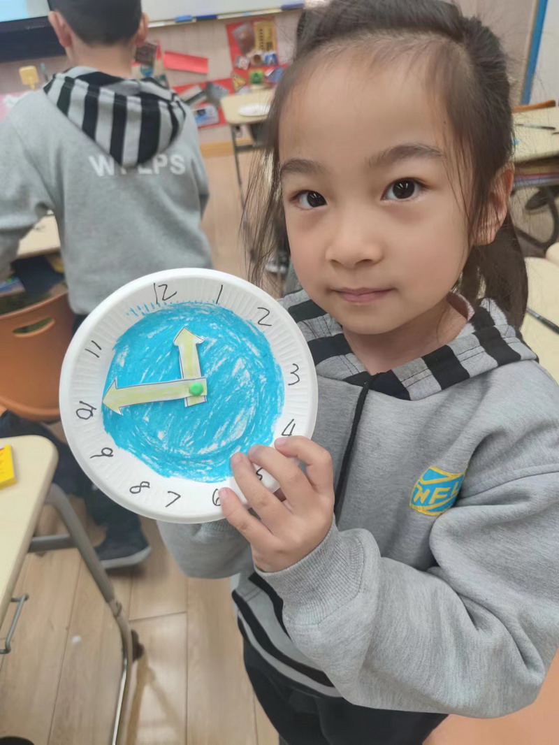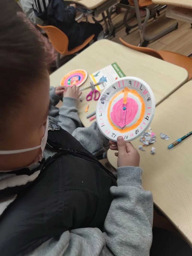 看!這是我們制作的時鐘,你知道我們是如何固定它的指針的嗎?