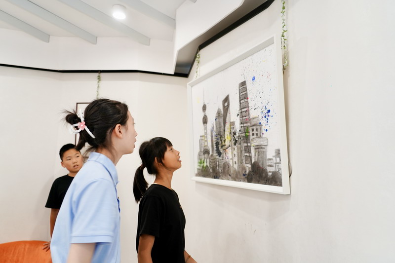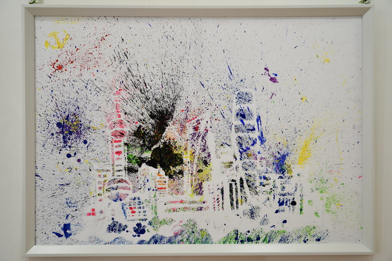 平時,我也喜歡參觀各種美術展,走出教室,身臨其境,感受藝術大師的氣息。參觀了著名藝術家蔡國強在浦東美術館舉行的“遠行與歸來”展后,我借鑒藝術家的創作方式,用爆裂噴灑的方式繪制了以東方明珠電視塔等建筑為主題的作品,以此來慶祝中國共產黨成立100周年。