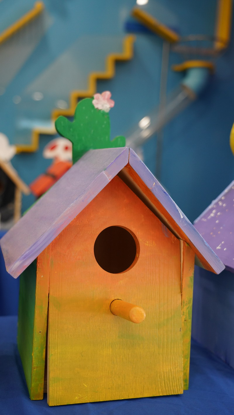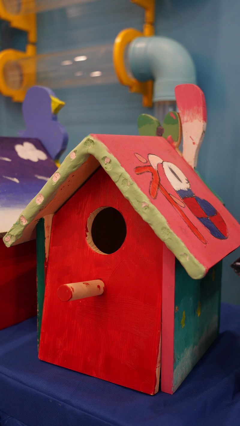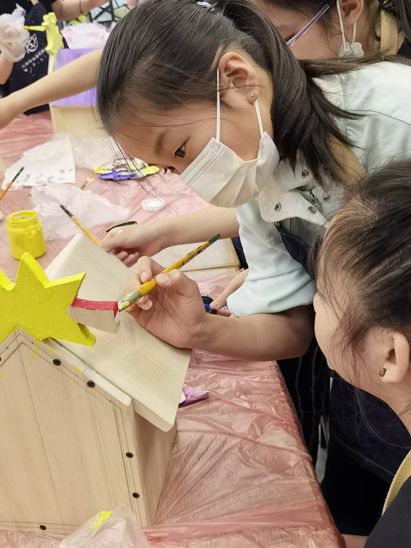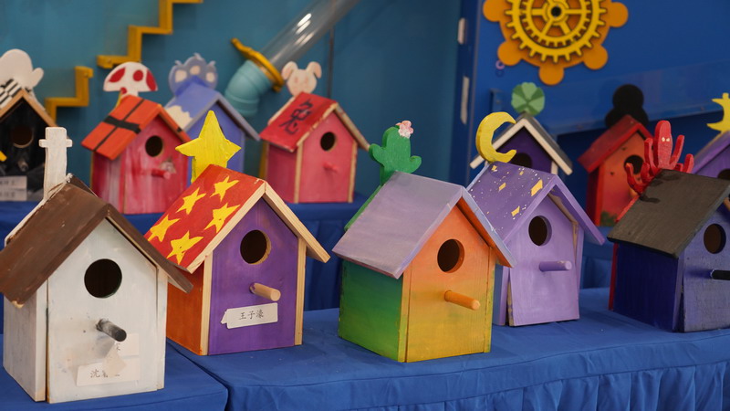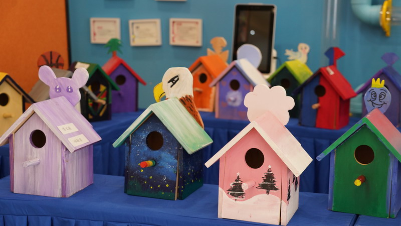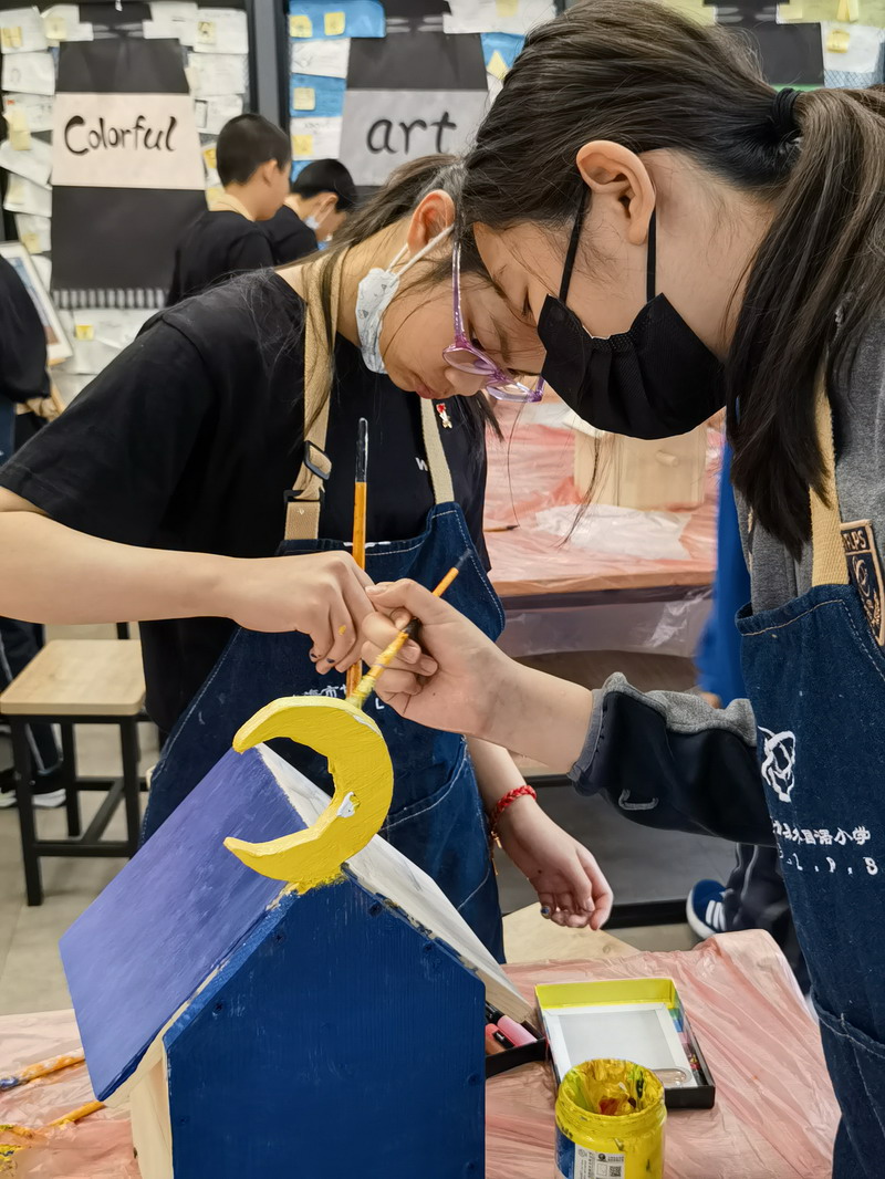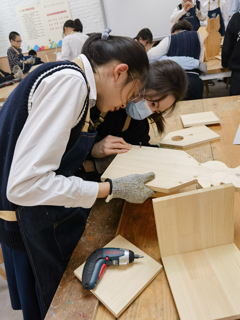 在打磨過程中,學生們仔細研磨每個木制零件,使其表面光滑平整,以便在組裝時更好地連接。最后,他們運用想象力和創造力,將鳥屋涂上豐富多彩的顏色,便于鳥兒們找到溫馨舒適的家。