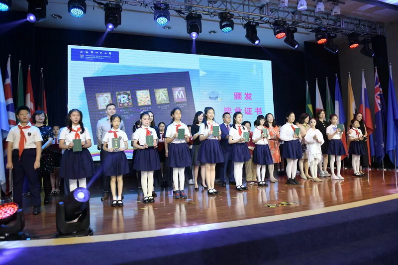 世外小學(xué)理事長(zhǎng)王均金先生,理事王小平、葉進(jìn)琦、王妍人女士,張悅穎校長(zhǎng)、陸素英副校長(zhǎng)和畢業(yè)班班主任們?yōu)槿w同學(xué)頒發(fā)畢業(yè)證書(shū)。