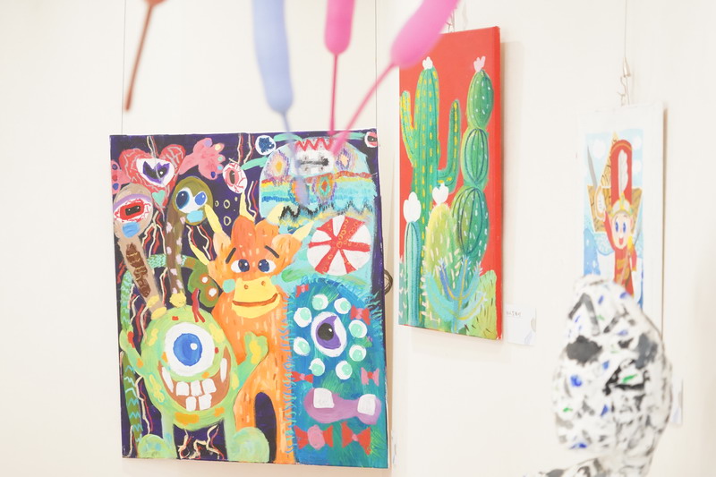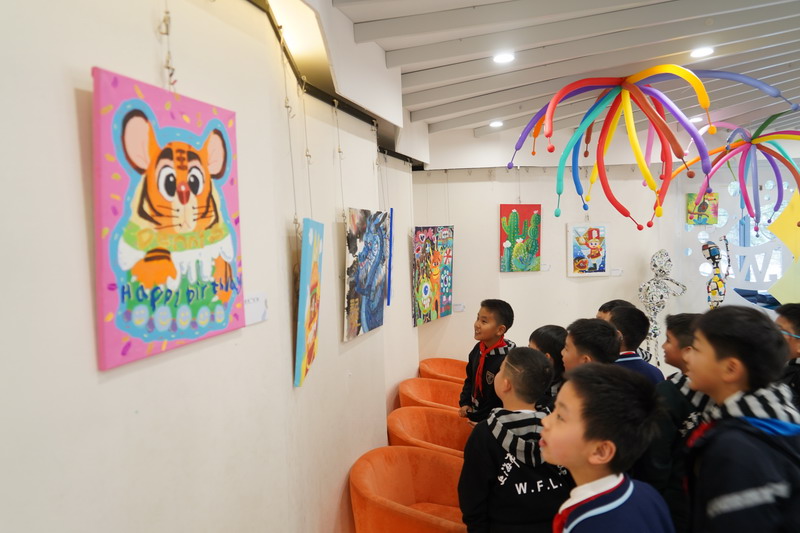 整個畫展的布置同樣亮眼,色彩斑斕的氣球、趣味十足的裝飾,讓展廳宛如童話世界般夢幻。同學們紛紛駐足欣賞,被這些富有童真和活力的畫作吸引,感受到了小謝筆下的溫暖與快樂。