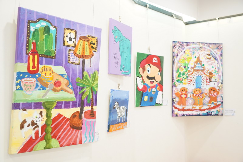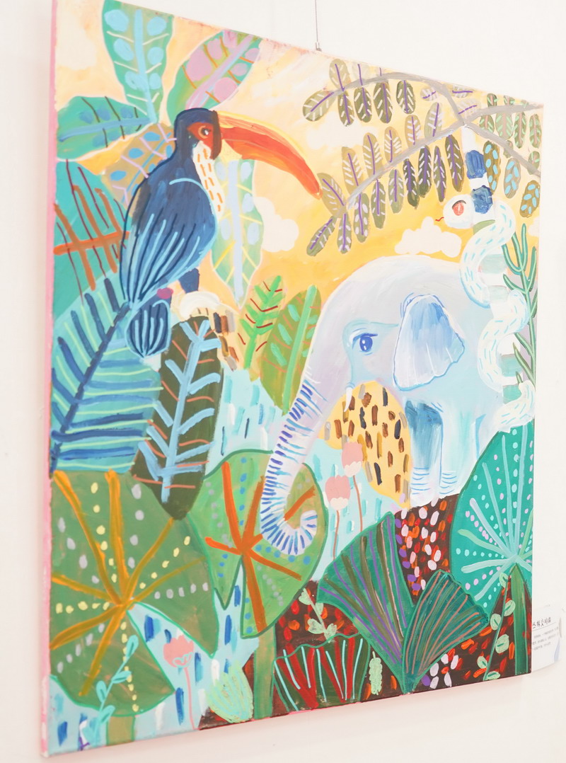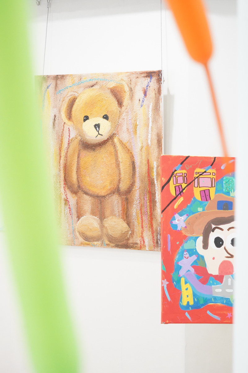 這次畫展,小謝帶來了許多充滿童趣、色彩繽紛的作品。從戴著貓耳機、沉浸在幻想世界中的少年,到充滿歡樂的玩具世界,還有那略帶神秘氣息的動物王國……每一幅作品都流淌著他對生活的熱愛和獨特的想象力。他用色彩講述自己的故事,用畫筆捕捉生活中的點滴美好。