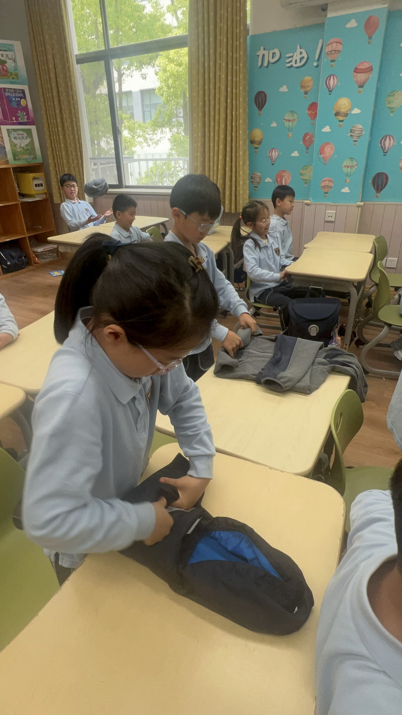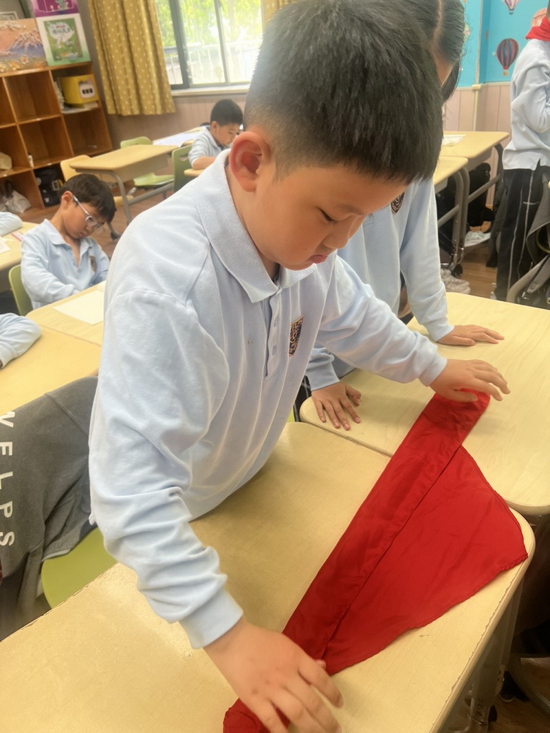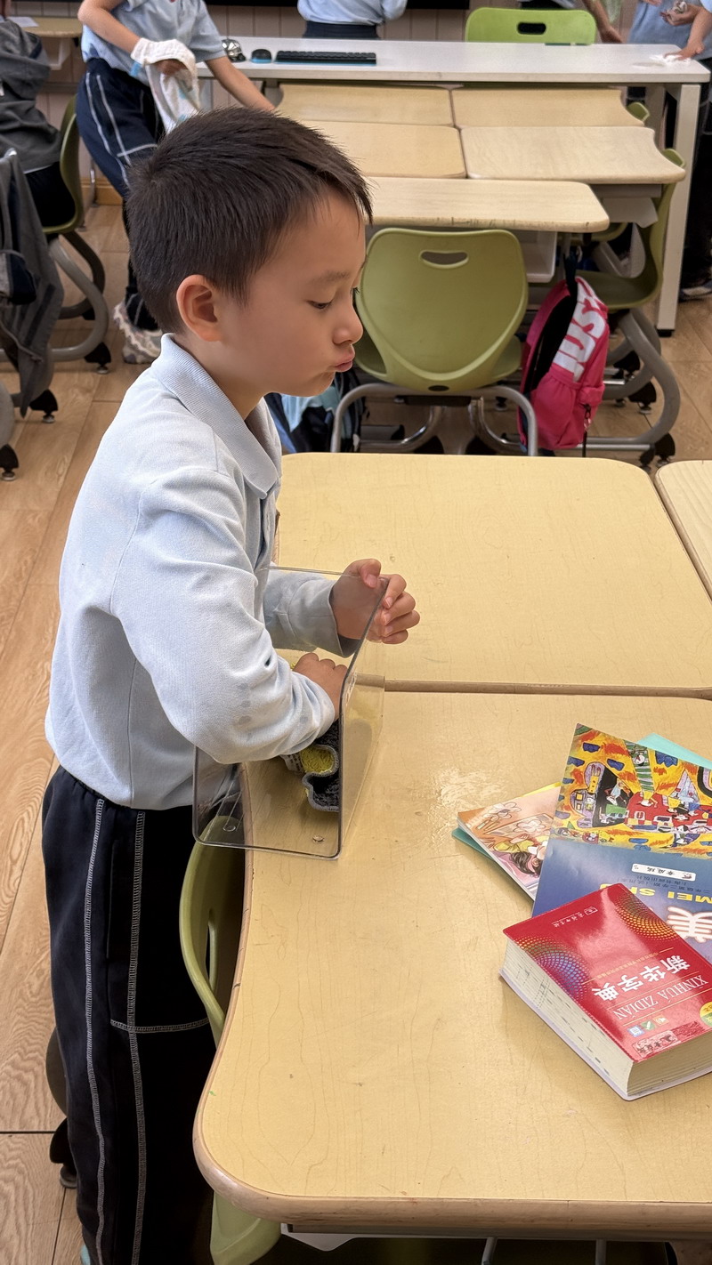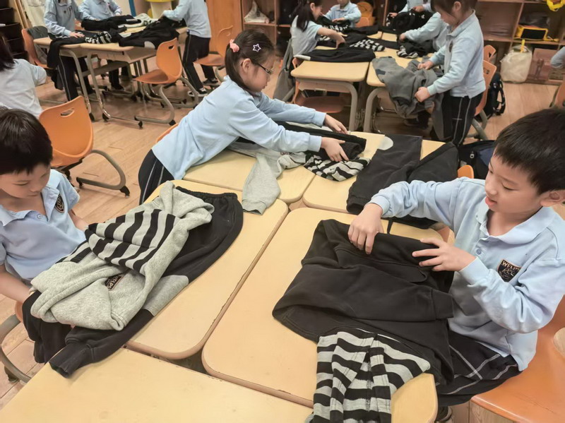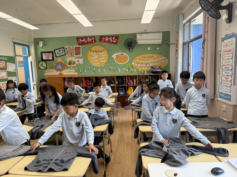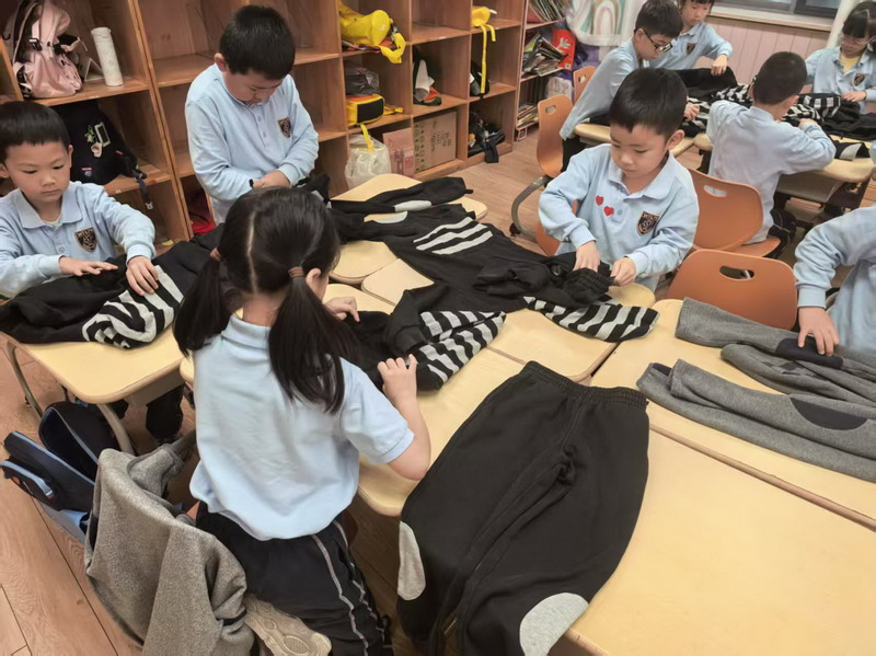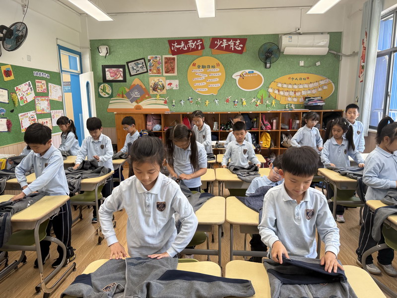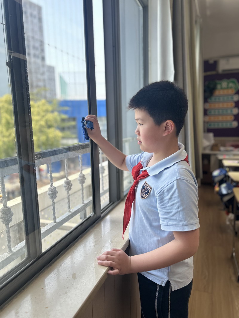 四年級的同學(xué)們迎來了一場“深度清潔挑戰(zhàn)”。他們分工合作,有的用長柄刷清理風(fēng)扇葉片,有的蹲身擦拭墻邊瓷磚,還有的將教室綠植的枯葉細(xì)心修剪。疊正裝校服環(huán)節(jié),孩子們將衣領(lǐng)袖口撫平,疊出棱角分明的“豆腐塊”??粗懊鲙變舻慕淌遥?/span>“勞動不僅是打掃衛(wèi)生,更是為集體貢獻(xiàn)力量的自豪感。”