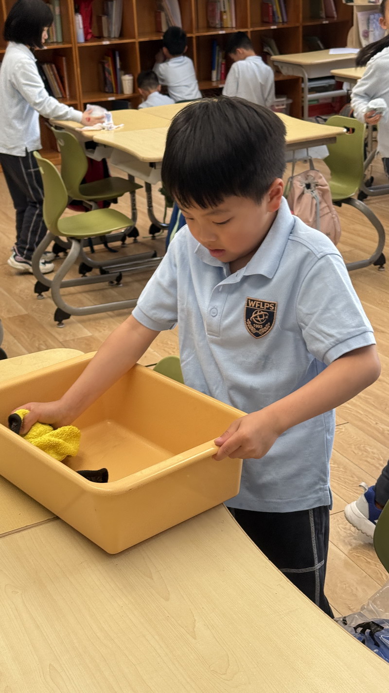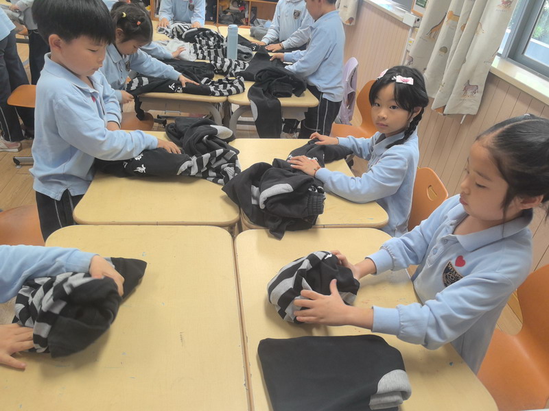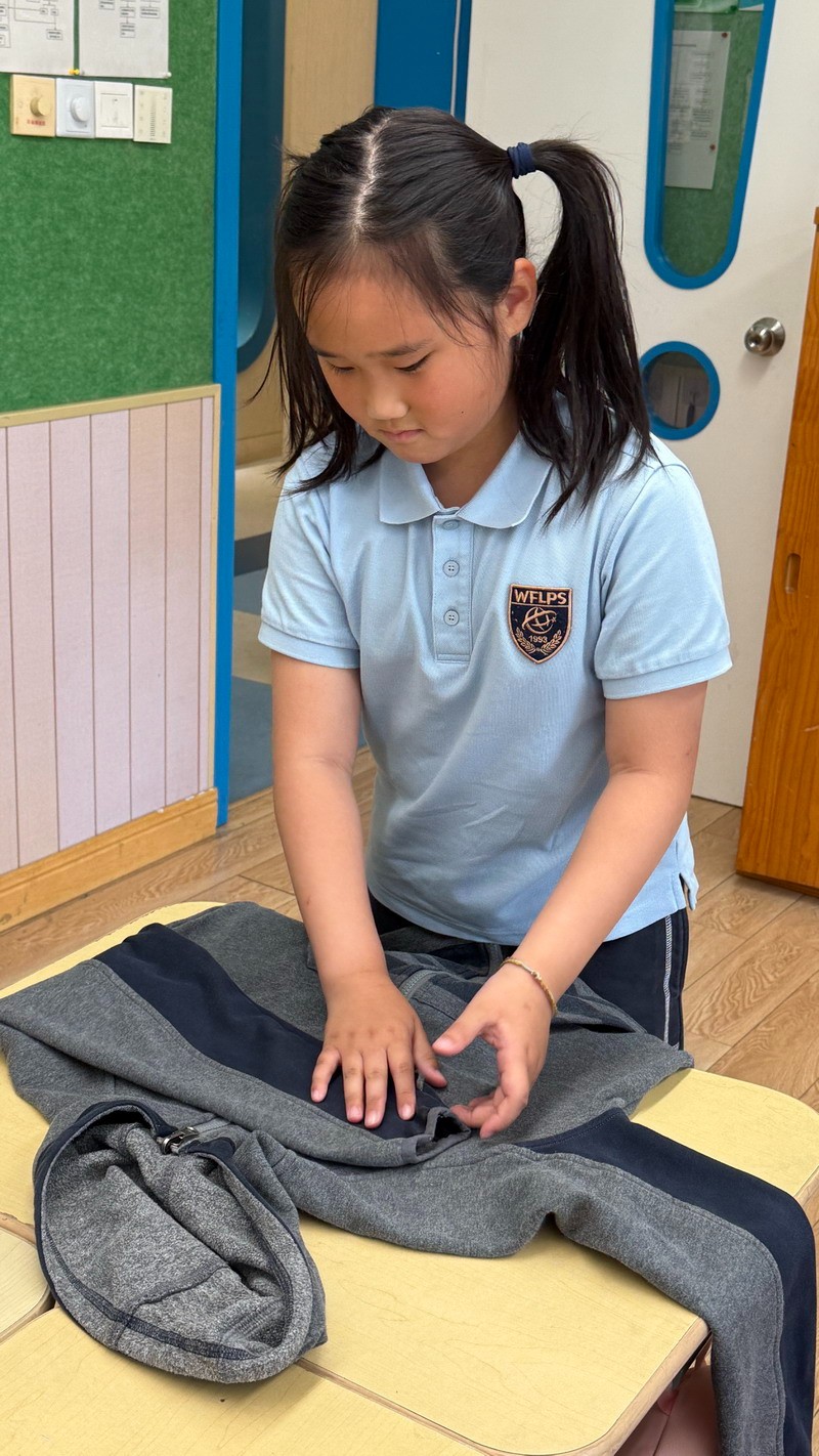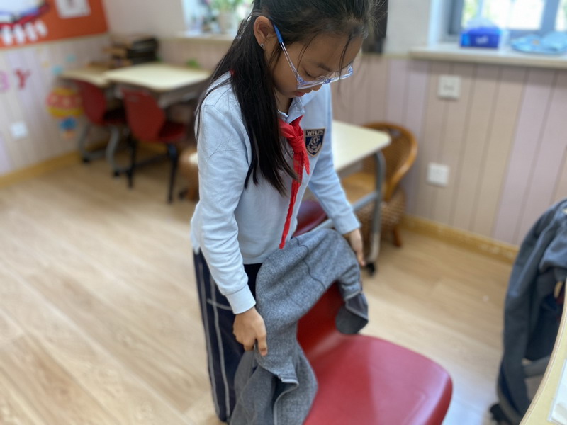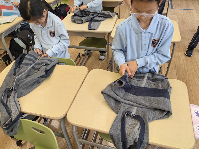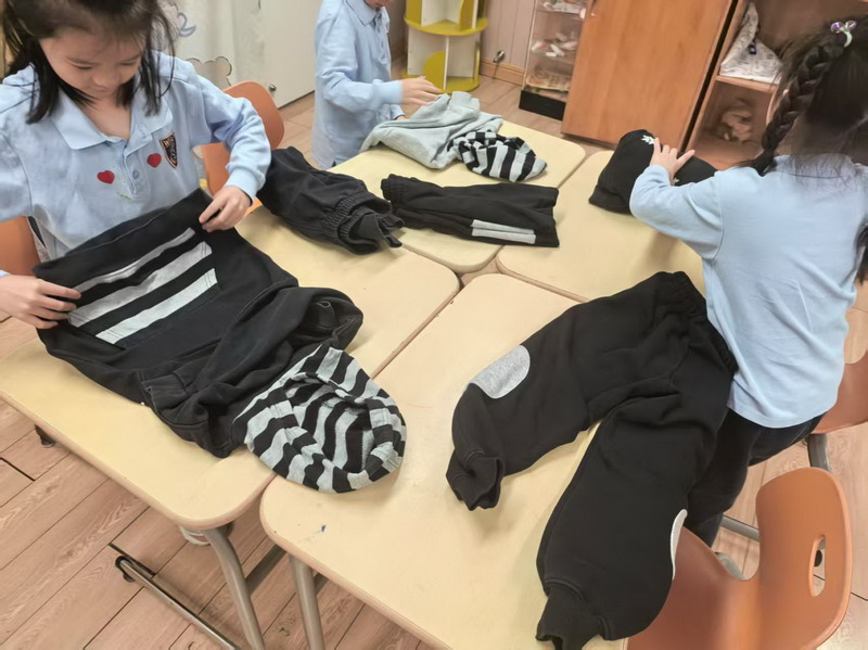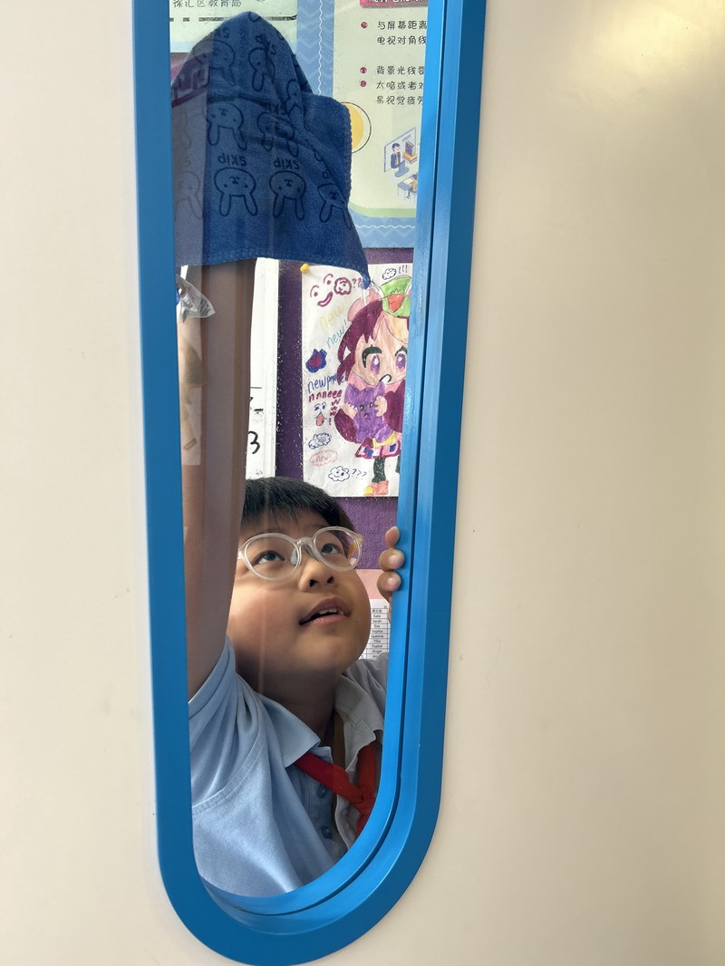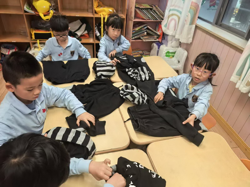 四年級的同學(xué)們迎來了一場“深度清潔挑戰(zhàn)”。他們分工合作,有的用長柄刷清理風(fēng)扇葉片,有的蹲身擦拭墻邊瓷磚,還有的將教室綠植的枯葉細(xì)心修剪。疊正裝校服環(huán)節(jié),孩子們將衣領(lǐng)袖口撫平,疊出棱角分明的“豆腐塊”??粗懊鲙變舻慕淌遥?/span>“勞動不僅是打掃衛(wèi)生,更是為集體貢獻(xiàn)力量的自豪感。”