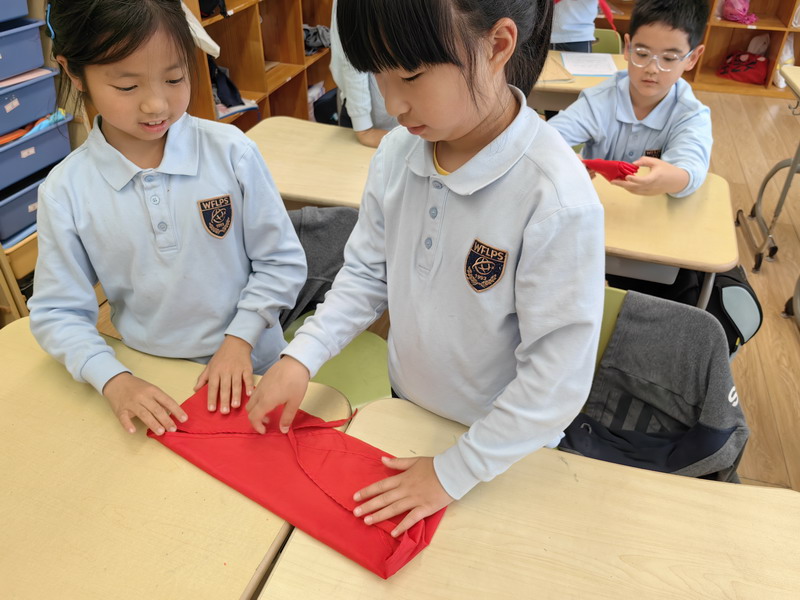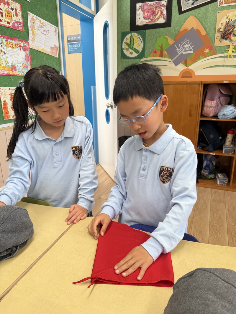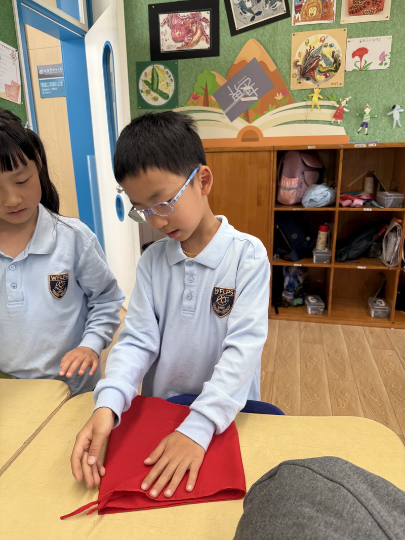 二年級的同學(xué)們將勞動與少先隊(duì)禮儀結(jié)合,開展了“紅領(lǐng)巾的儀式感”主題活動。他們不僅掌握了快速系鞋帶的技巧,還通過視頻學(xué)習(xí)、同伴互評,規(guī)范了紅領(lǐng)巾的折疊與佩戴方式。疊灰鼠校服時,孩子們細(xì)致對齊每一處褶皺,將“整齊”二字融入日常習(xí)慣。班主任老師表示:“折疊紅領(lǐng)巾看似簡單,卻能培養(yǎng)孩子對細(xì)節(jié)的重視和對少先隊(duì)員身份的認(rèn)同。”