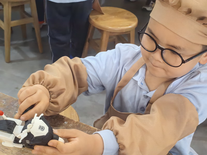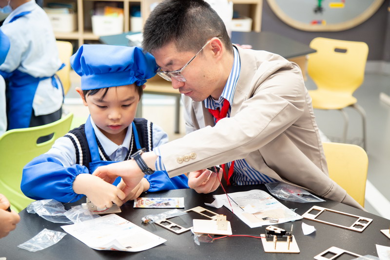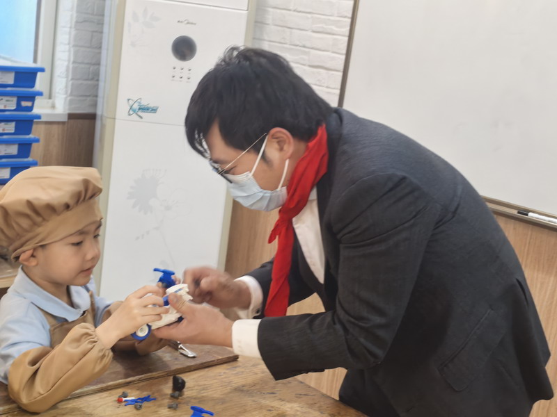 工程師爸爸、DT爸爸帶著孩子們來到 DT 教室、科學教室,給他們介紹神奇的勞動工具。孩子們的眼睛都亮了,這些平時看起來普通的工具,在爸爸的手里就像變魔術一樣。爸爸們準備充分,用專業的知識樸實的言語一邊講解電的原理,工具的使用方法,一邊提醒孩子們要注意安全。孩子們迫不及待地動手操作起來,一個個小汽車、小飛機被組裝完成,一盞盞小燈泡被亮起,孩子們臉上的笑容,那份成就感油然而生,今天,一個個都成了“小小工程師”。