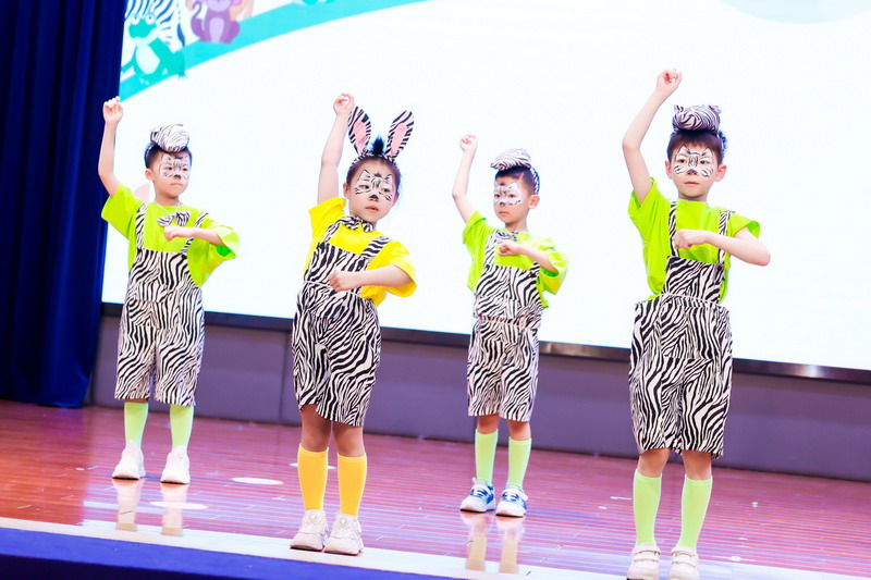 一A班的同學(xué)來啦!他們化身為熱帶雨林的鸚鵡、老虎、青蛙、蜘蛛,用舞蹈展示熱帶雨林動物的風(fēng)采!