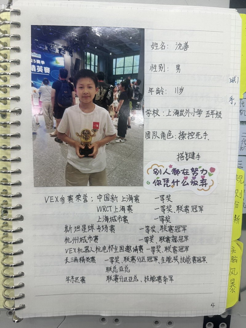 面對分區冠軍、全球第五名的優異成績,沈善既開心又驕傲,但他也保持著難得的清醒與謙遜。他清晰地看到了與世界頂尖水平的差距,這為他指明了未來精進的方向。他為自己規劃了清晰的成長路徑:在機器人結構設計、編程邏輯的嚴謹性、工程記錄的規范性以及團隊協作的默契度上,都需要持續投入。他計劃針對薄弱環節進行強化訓練,并積極向頂尖團隊學習高效的時間管理和精細的技術處理經驗。此刻,他已滿懷期待地將目光投向了更具挑戰性的目標——2026年機器人世錦賽初中組賽事,準備開啟新的征程。