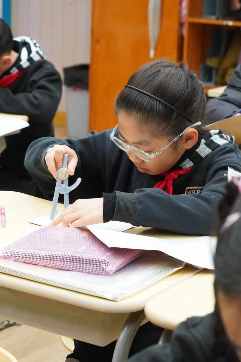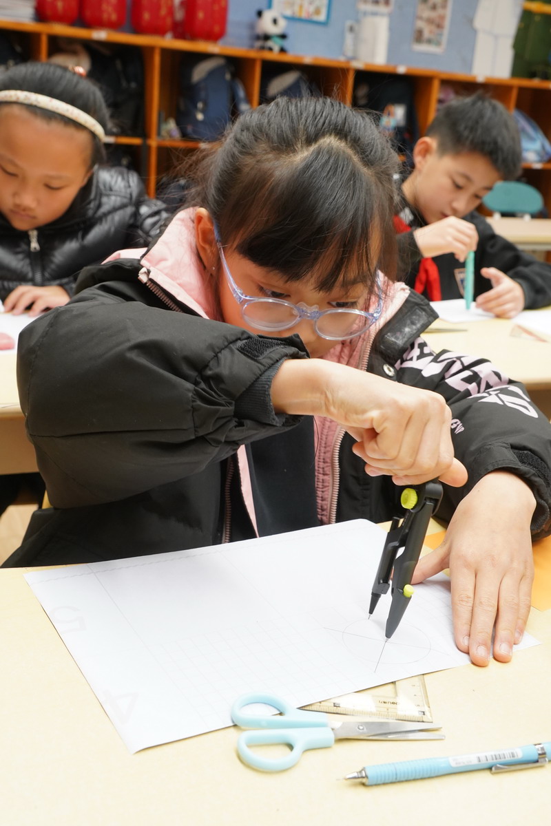 在創作開始前,孩子們先在數學課堂中系統認識“圓”——從圓心、半徑、直徑等基本概念出發,理解圓的結構與特征,并探究圓在生活中的廣泛應用。在此基礎上,學生用親手制作的圓規嘗試畫圓,在嘗試中體會“精準”與“變化”的關系,讓抽象的數學知識轉化為可感、可用的實踐經驗。