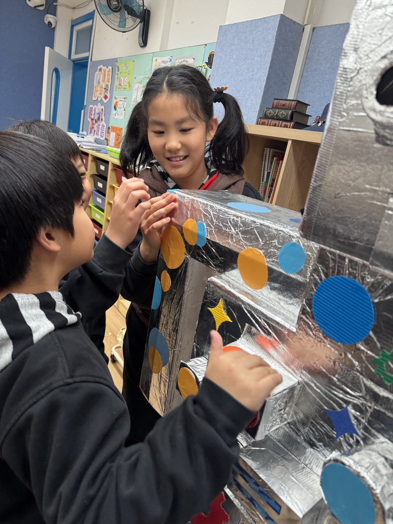 機身布滿不同大小、不同材質的圓形貼片;金屬質感與彩色圓點形成強烈對比;冷冰冰的“機器人”被孩子們一點點貼出溫度與童趣。