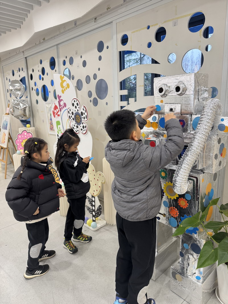 除了平面繪畫,孩子們還將“圓”的元素延伸到立體創作中。展區中最吸引目光的,是由學生參與裝飾完成的大型機器人藝術裝置。