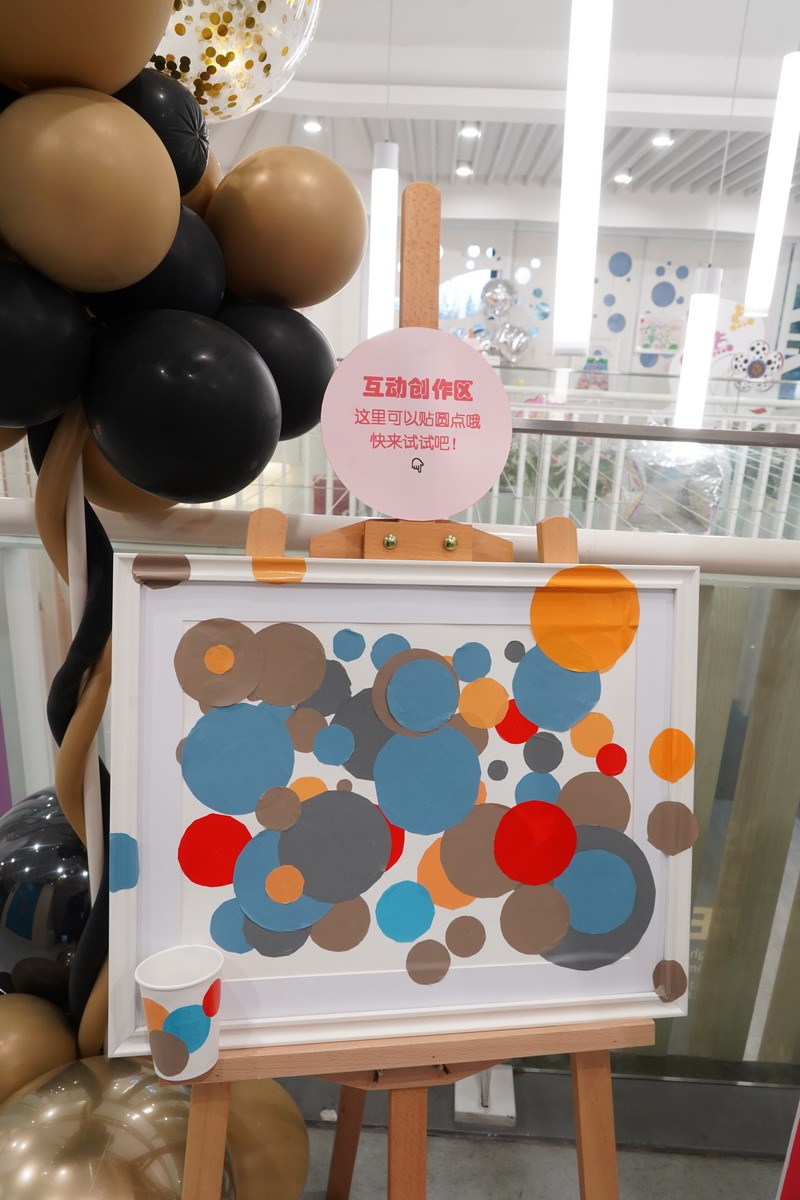 本次藝術展特別設置了“互動創作區”。在這里,孩子們可以用畫筆畫圓、用彩紙剪圓、用各種材料制作圓形貼片,然后走進展區,將自己的“圓”貼到空白畫框上。