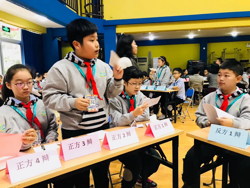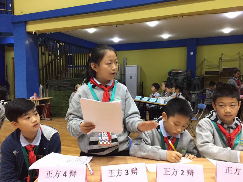五年級的辯論賽盡管是第一次嘗試,但精彩紛呈的場面真是令人不容小覷,嘖嘖贊嘆。關于"一個三歲的孩子即將從高樓的窗臺上落下,作為一個十歲的你,是應該伸手去接?還是不接?"賽前,學生已拿到辯題,多日的準備工作中,他們在老師的指導下了解辯論方式;他們從正反兩方查找資料,準備論據;他們練習辯論技巧……孩子說,感覺自己這回真的是"腦袋里兩個小人在打架"。正式賽場上,學生隨機組合,抽簽決定正反方和辯論角色。辯場上,有的滔滔不絕,有的慢條斯理,有的大氣沉穩,有的睿智幽默。"伸手,是一種生理反應,是為人的本能。""兩害相權取其輕。""為拯救生命,我們可以作出任何的犧牲。""救人要有方,否則就是害人。"……各種論點,各種佐證,精彩萬分。每個孩子都有其豐富的內心世界和辨證的邏輯思維。今天,他們讓我們看見。
