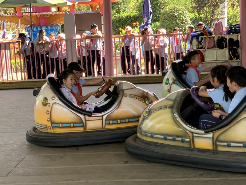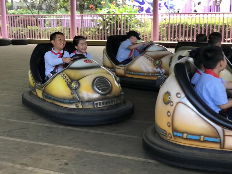 從這長(zhǎng)長(zhǎng)的排隊(duì)人數(shù)就可判斷,一定是在排“碰碰車”。三年級(jí)的小朋友喜歡這種同伴間互動(dòng)性較強(qiáng)的項(xiàng)目,在不斷的碰撞中,友情的程度也重重加深地加深了。從這個(gè)項(xiàng)目中,我們了解,同學(xué)之間,只有喜歡,才會(huì)讓我不顧一切的撞上你。