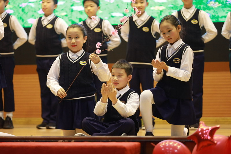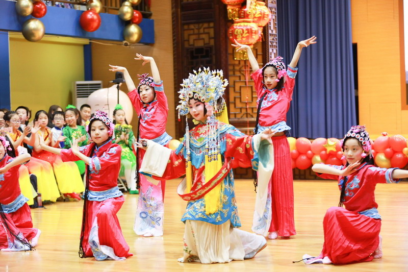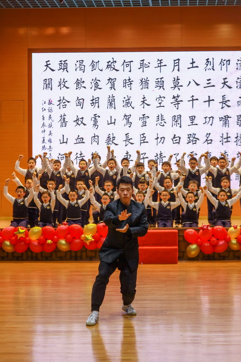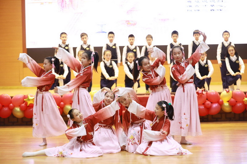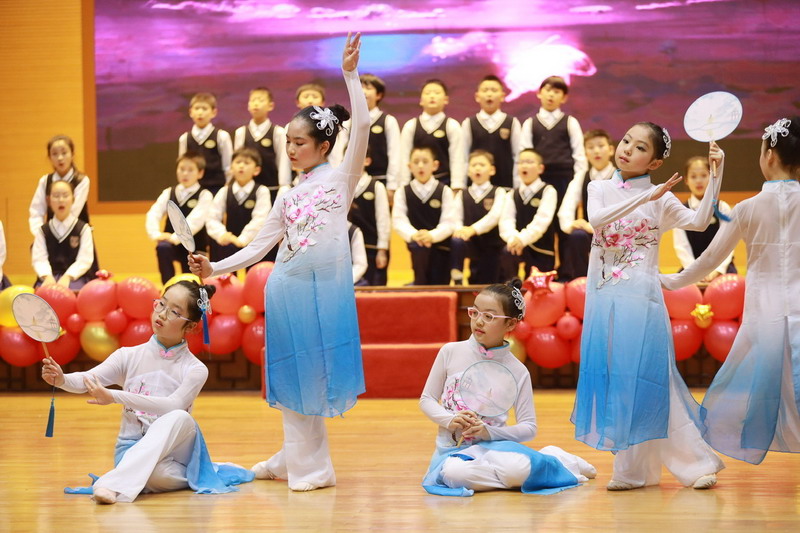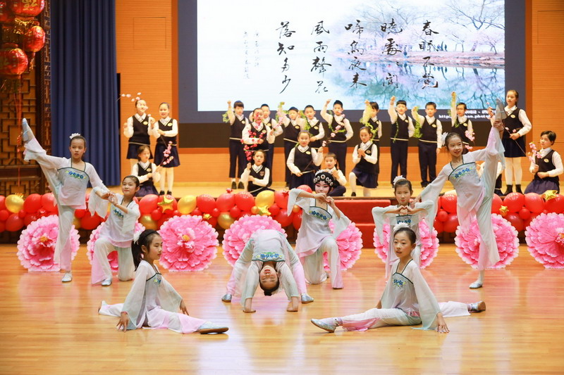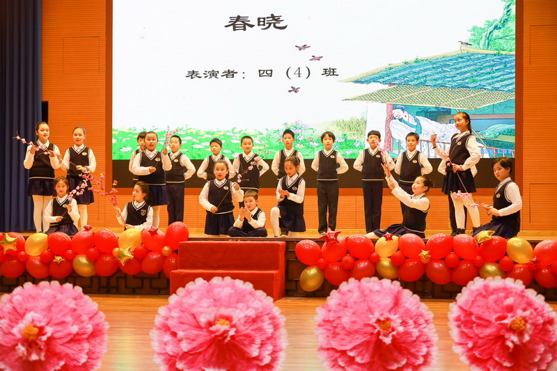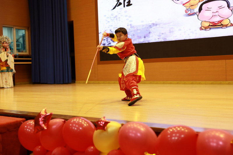 接著孩子們換上古裝,載歌載舞,表演了古詩文聯唱、武術操《少林英雄》、京劇《梨花頌》。這些節目都來源于學校豐富的課程與多彩的活動。