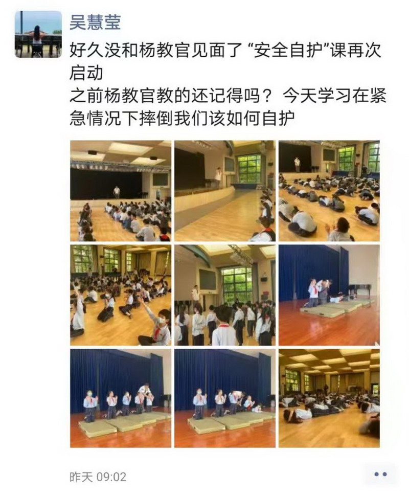 近日,我們的老朋友“楊教官”來到三個部門,給同學(xué)們教授了新的自護本領(lǐng)。上課伊始,楊教官先帶大家復(fù)習(xí)了SOS的抱頭姿勢,雖然有一段時間沒有見面了,但是同學(xué)們可都記得牢牢的呢!瞧,同學(xué)們將頭部護得牢牢的,讓“敵人”沒有可乘之機。These days, our old friend--“Coach Yang”has the lesson for three sections. He taught the students new skills. At the beginning of the lesson, Coach Yang led the students to review the skills of SOS posture. Though it has been quite a long time no see, the students are still keep it in mind. Look, the students are covering the head carefully to avoid the enemy’s attack.