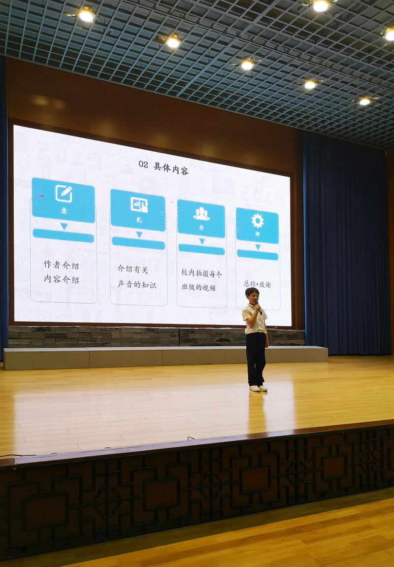 最后,三(4)班的張公霖同學(xué)單人成組,上臺(tái)介紹了他所研究的課題“三年級(jí)哪個(gè)班級(jí)的同學(xué)聲音最大?”。雖然它看似是一個(gè)非常小的研究課題,但張公霖同學(xué)認(rèn)真的研究態(tài)度還是得到了他們班級(jí)同學(xué)一致的認(rèn)可,推舉他來(lái)參加今天的分享會(huì)。在經(jīng)驗(yàn)分享過(guò)程中,張公霖同學(xué)從選題目的、具體內(nèi)容、如何拍攝和作品亮點(diǎn)四個(gè)方面和同學(xué)們做了交流,為同學(xué)們之后制作課題研究的視頻提供了很多寶貴的經(jīng)驗(yàn)。