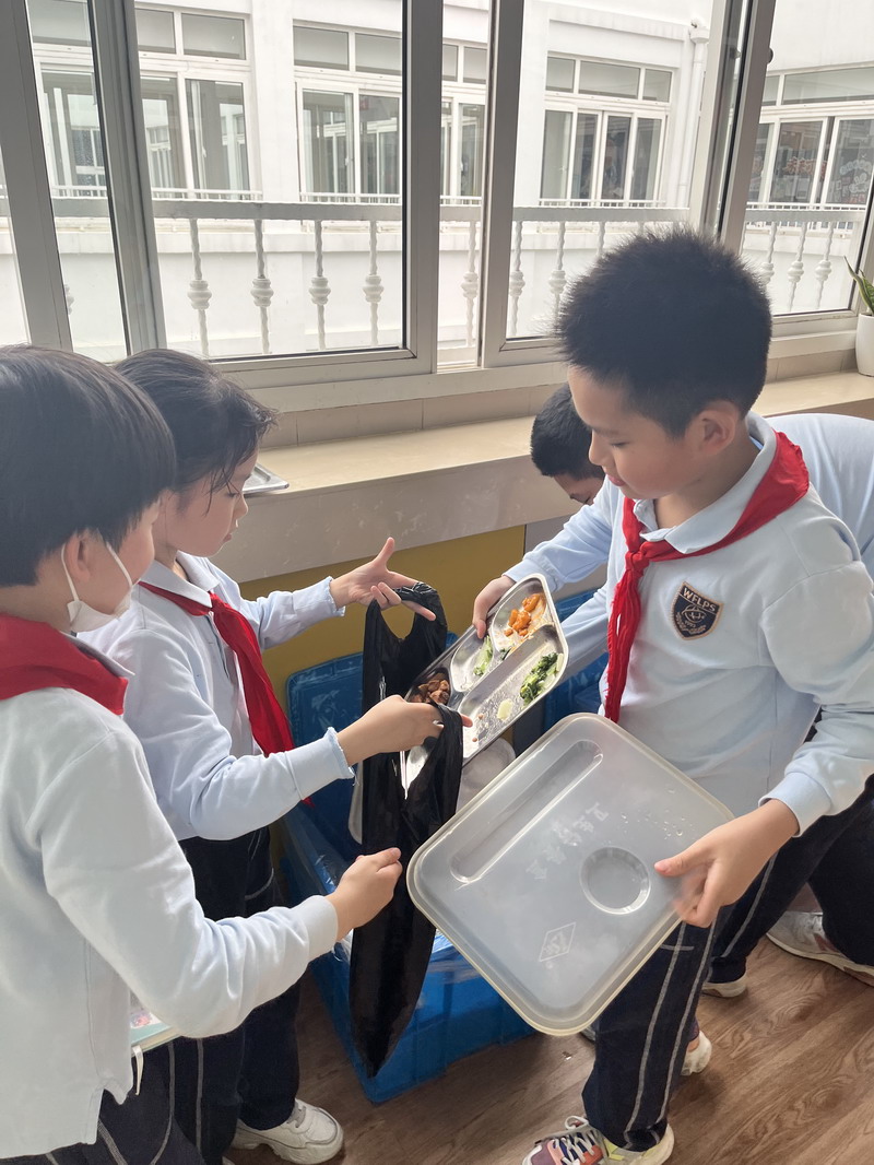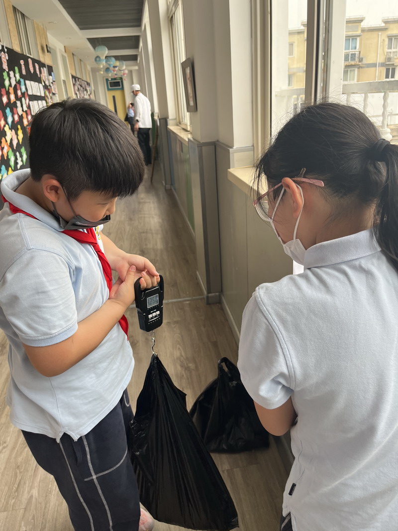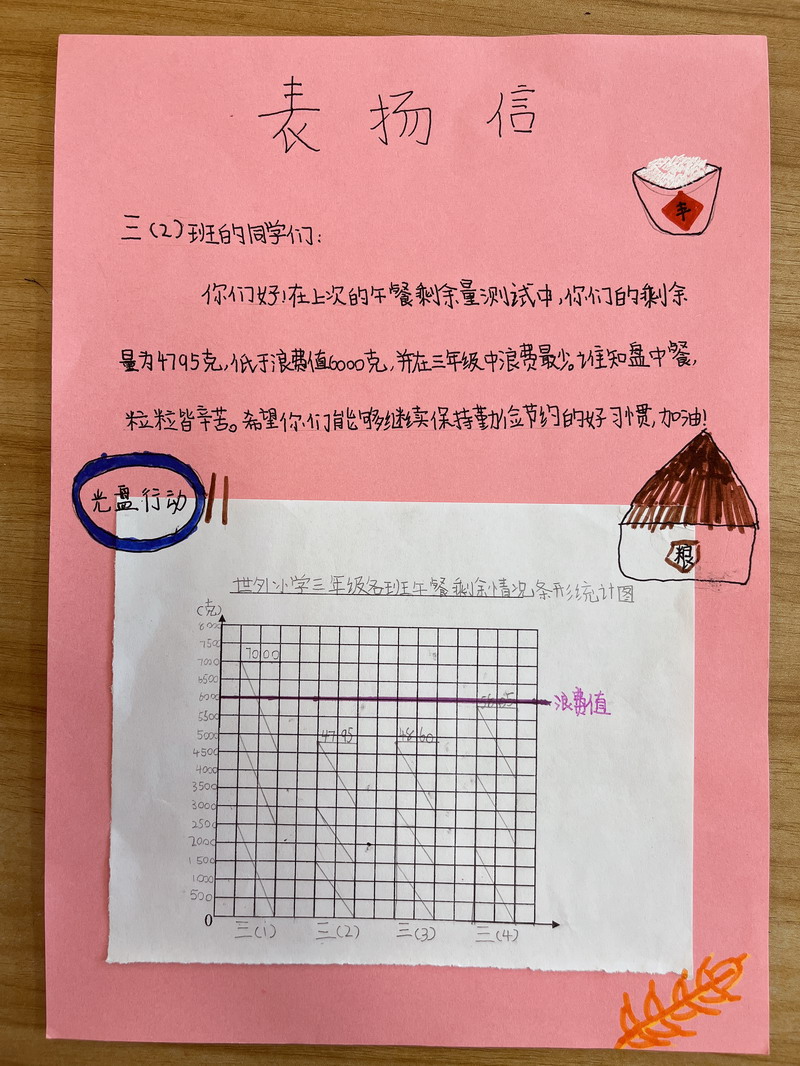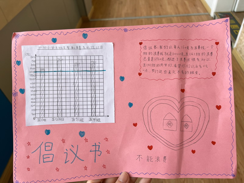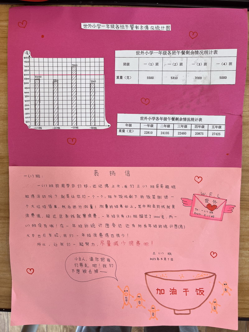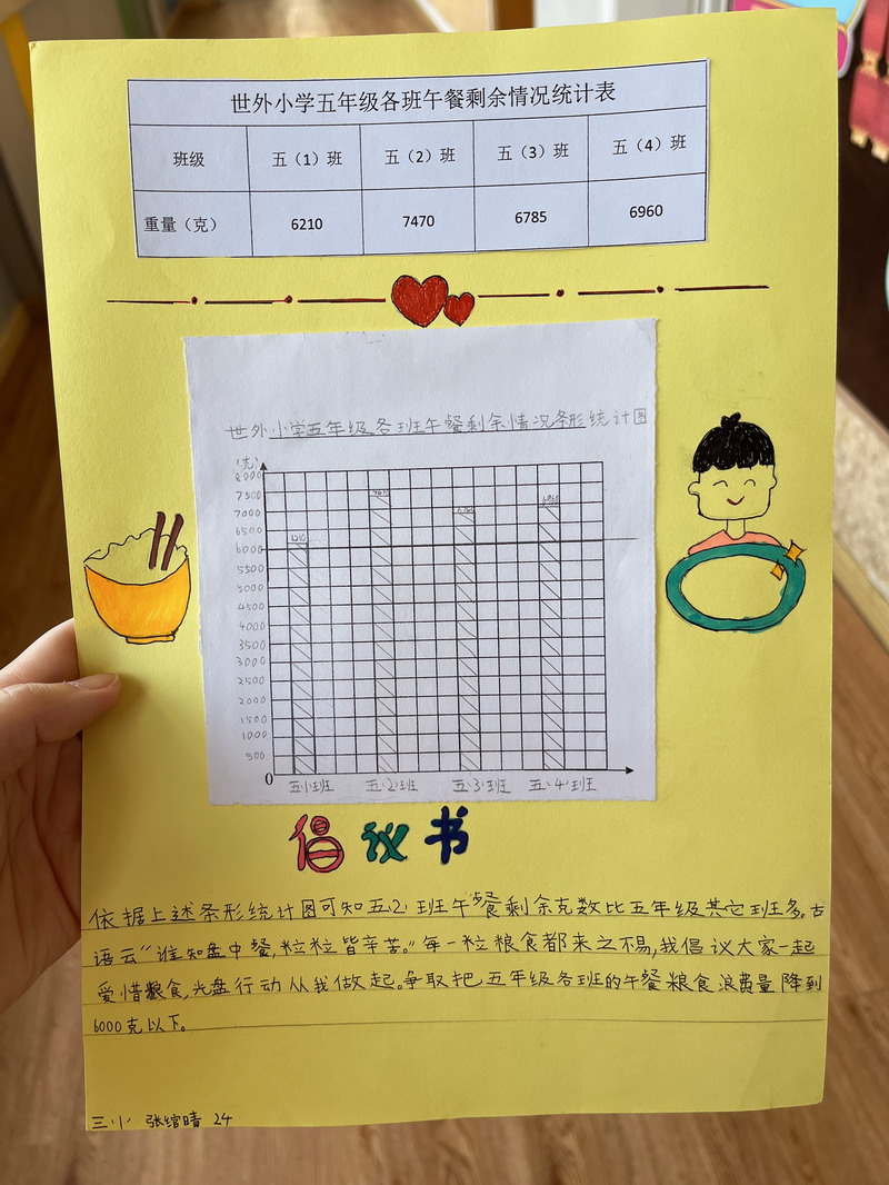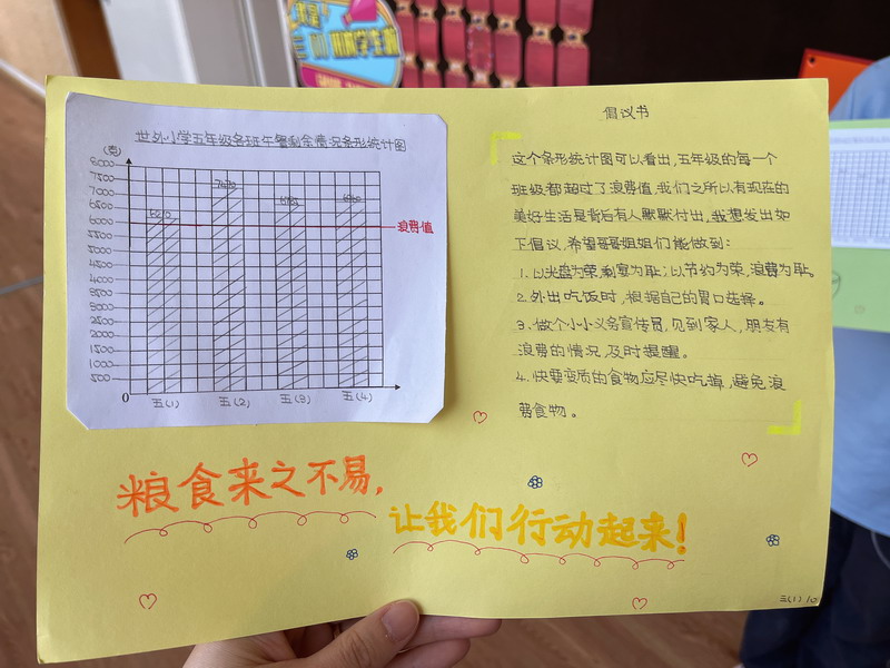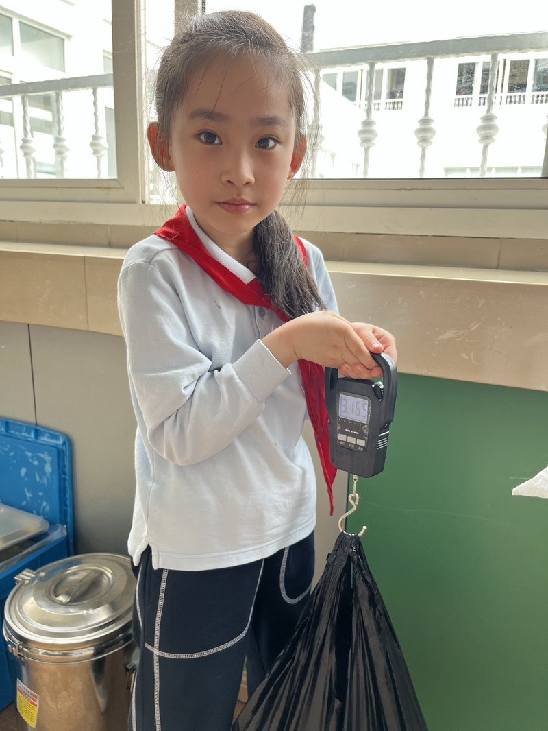 于是,學生們把各班中午剩余飯菜進行了收集和秤量,記錄下每個班級的糧食剩余量。