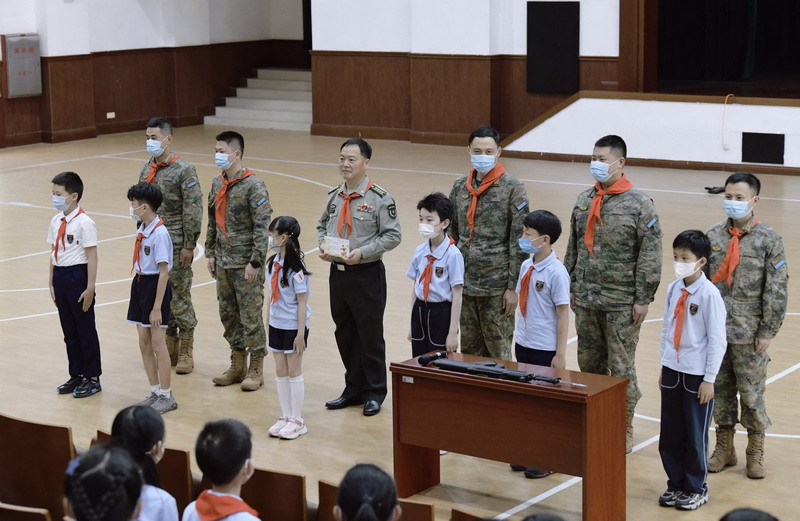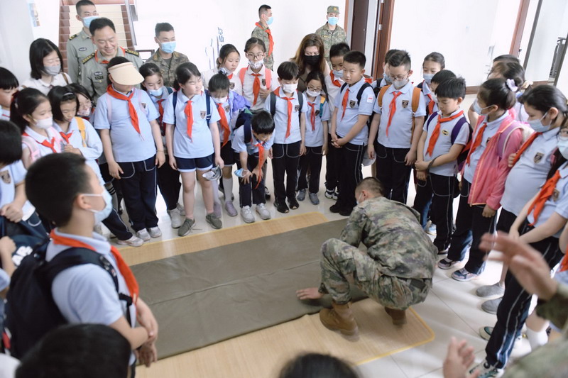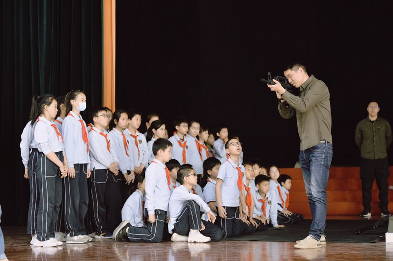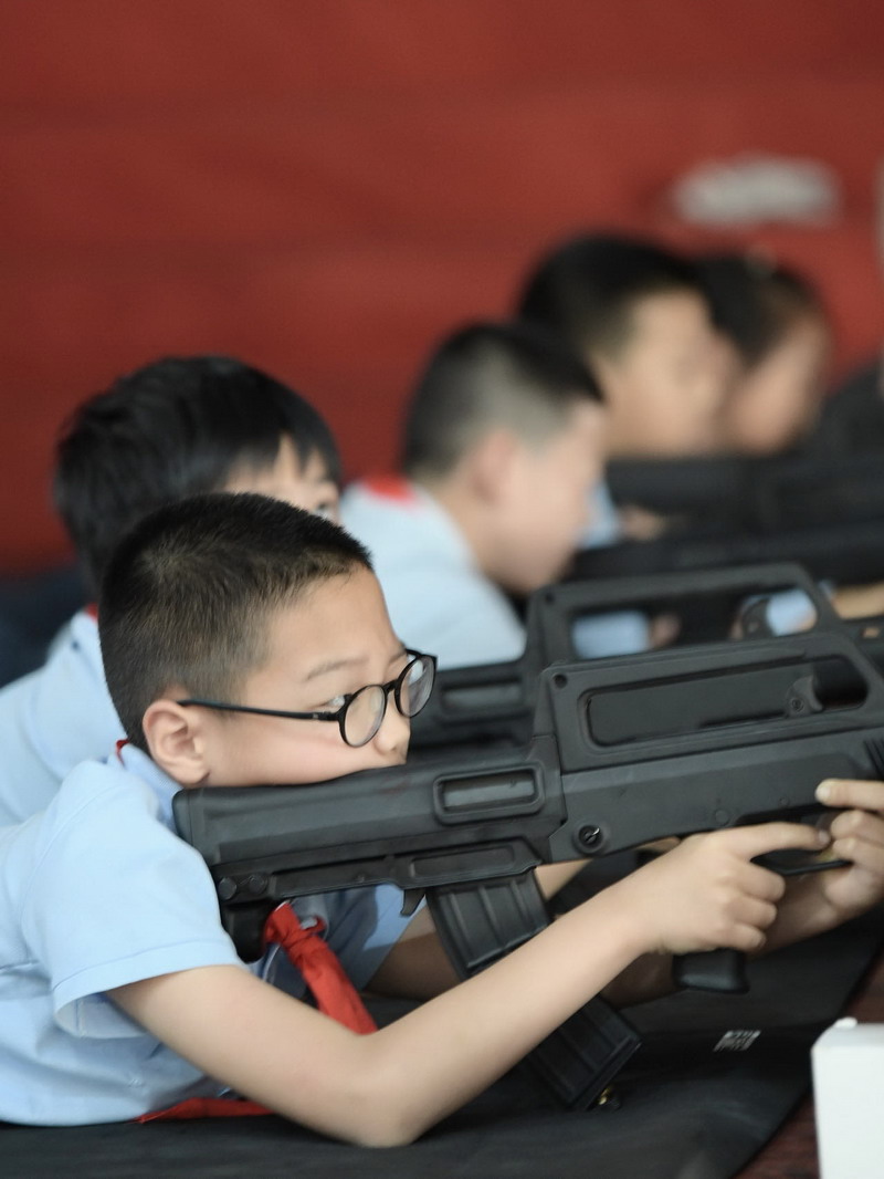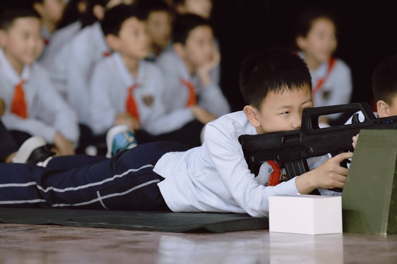 觀看連隊操練展示和槍械裝卸表演,孩子們躍躍欲試,紛紛要求上臺一展身手,雖然動作稚嫩,但是有模有樣地盡力保證每個動作雄赳赳氣昂昂。最令孩子們興奮的是射擊體驗:調整姿勢,屏氣凝神,三點一線,對準目標,射擊……在感受到槍械的重量的同時,體會到軍人們肩上扛起的世界和平,國家安穩,百姓安全的重量!