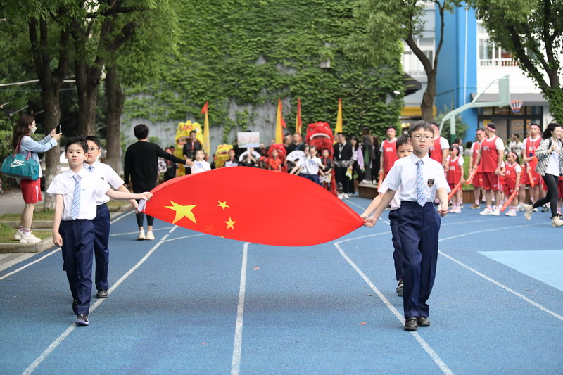 瞧,走在隊伍最前面的,是國旗護衛隊,表示同學們將祖國放在第一位,立志要為祖國增光,為國旗添彩。緊跟在國旗隊伍身后的,是世外小學校旗方隊。藍白相間的校旗,是世外小學的象征,更是生機和活力的象征。
