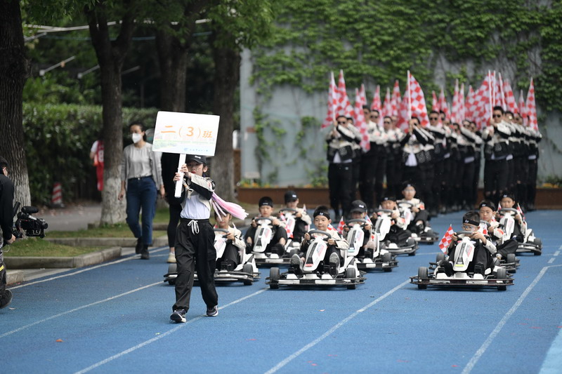 緊接著是二3班的卡丁車方陣。看,旗舞爸爸們身穿統一的服裝,手持紅白賽車旗。他們用鮮紅的旗幟舞動青春,他們用強有力的手臂向我們展示速度,力量。