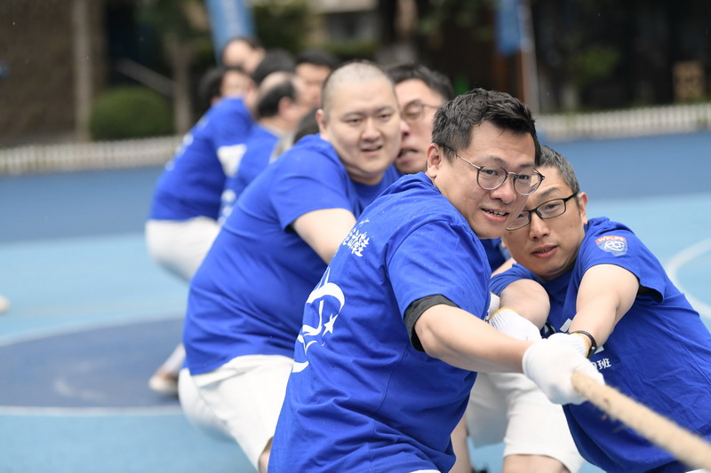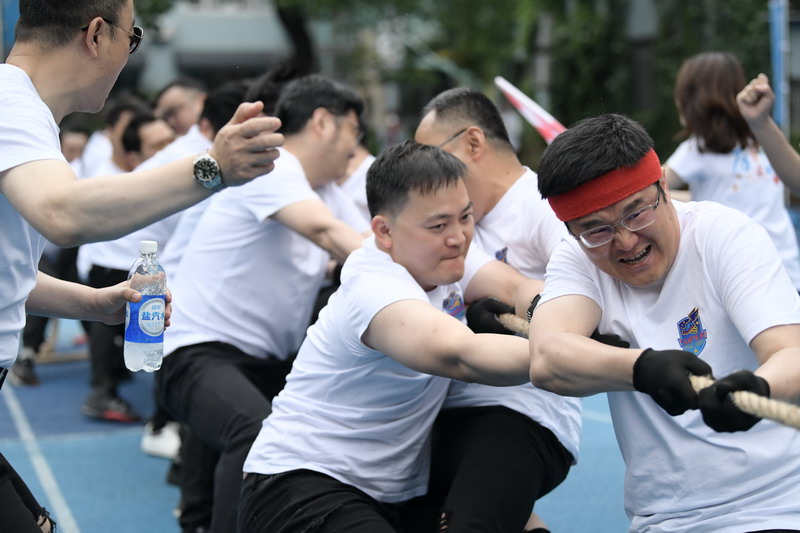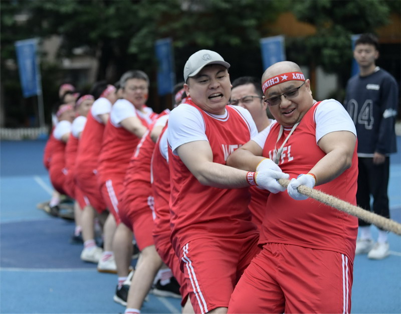 下面進入親子運動PK賽環節。第一個項目是拔河比賽,這是四個班級重量級爸爸們的較量,不僅考驗爸爸們的力量,更加考驗團隊的凝聚力和意志力!場上的爸爸們拼勁全力,賽場上充滿了加油吶喊聲。