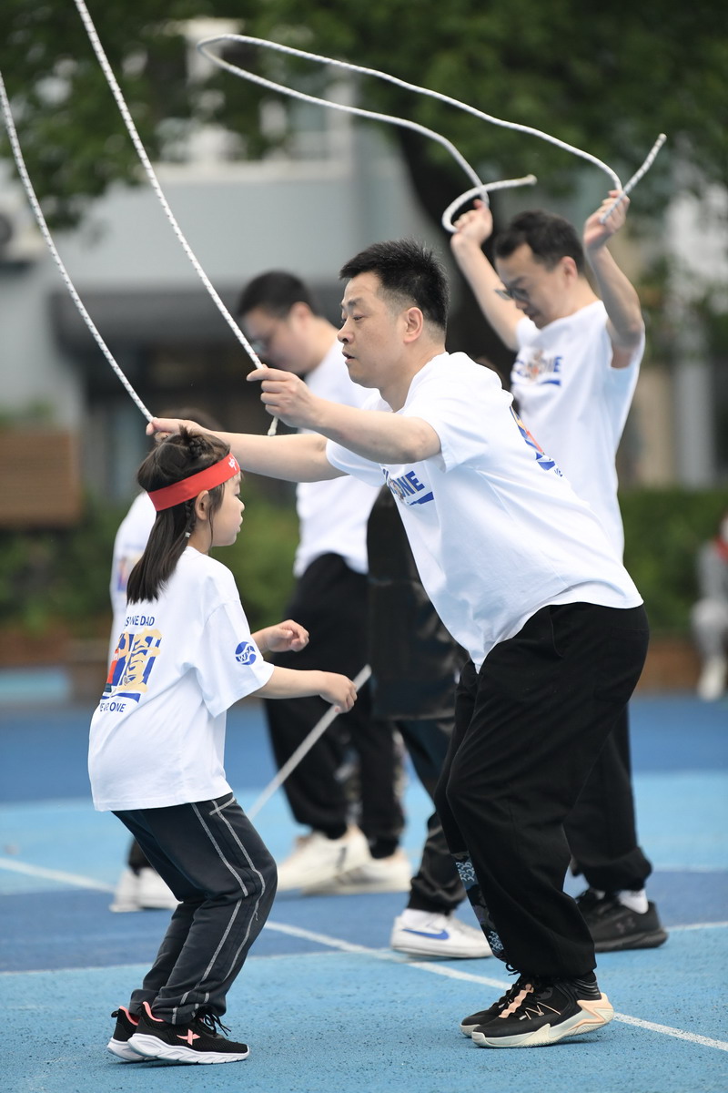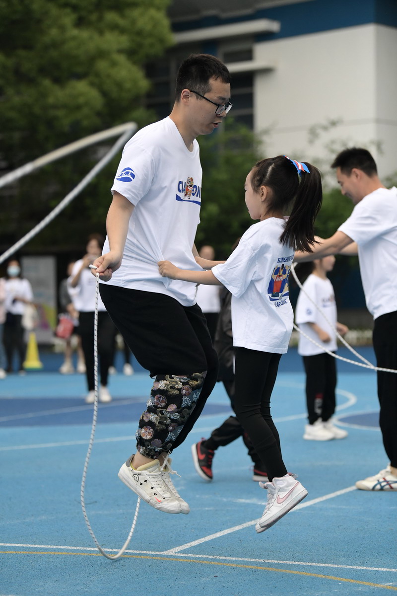 接下來是親子跳繩比賽。孩子們和爸爸在家練習了這么久,實力都不容小覷,不僅有速度,合作得也非常默契。