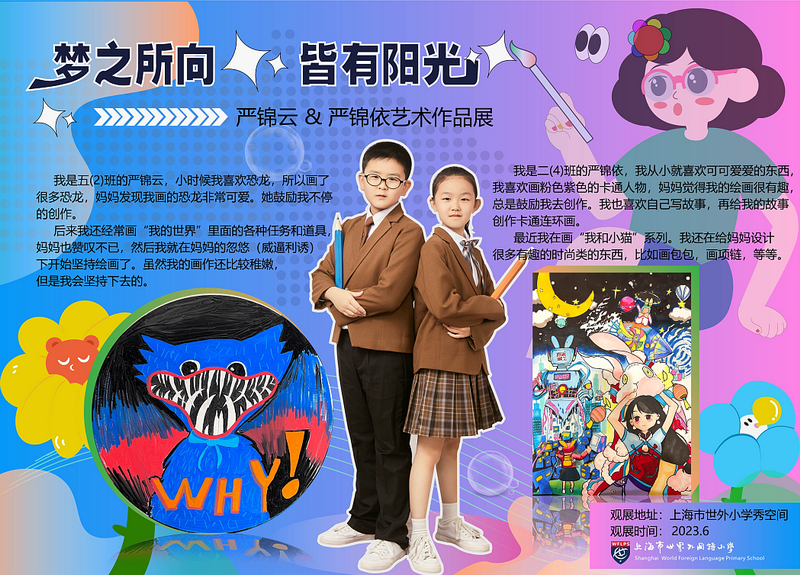 此次畫(huà)展是由五4班王云邈和來(lái)自五2的哥哥嚴(yán)錦云,二4班的妹妹嚴(yán)錦依攜手呈現(xiàn)。