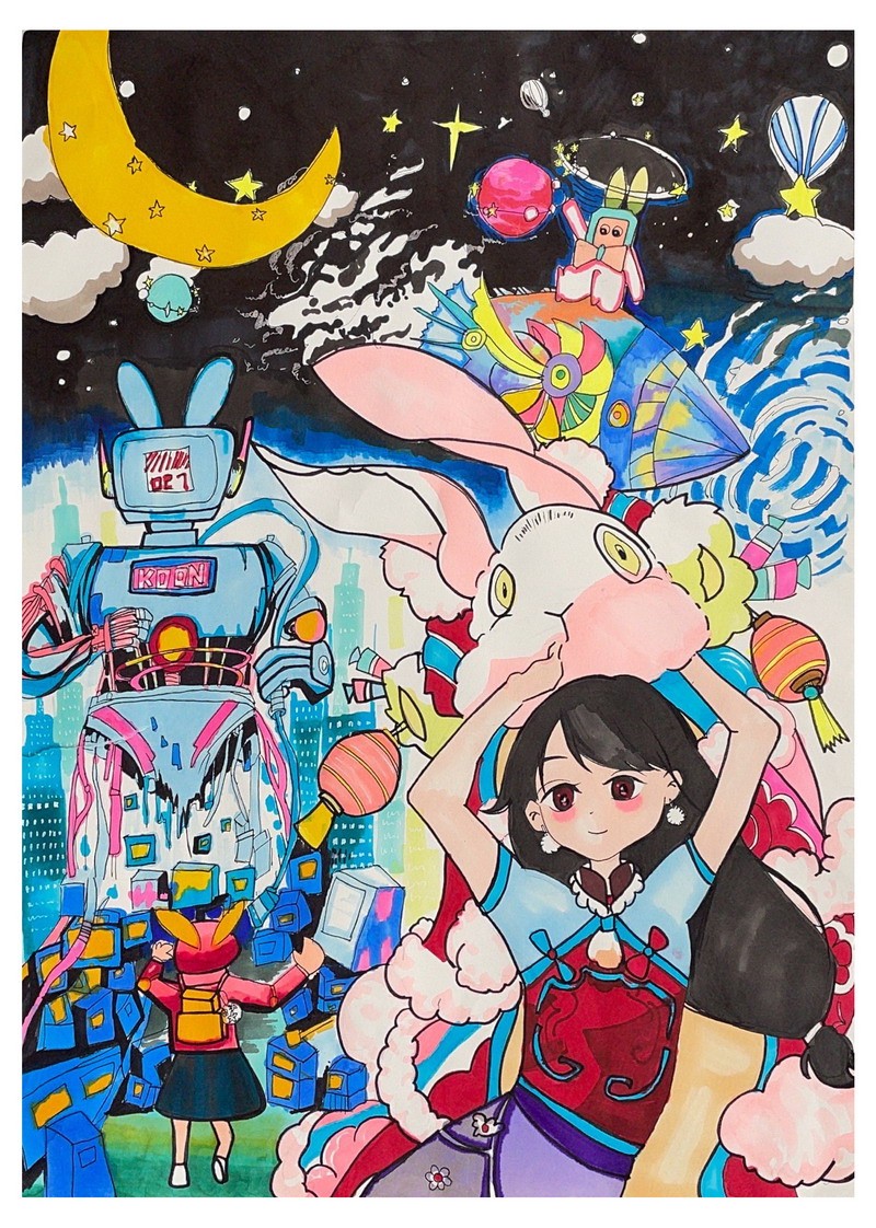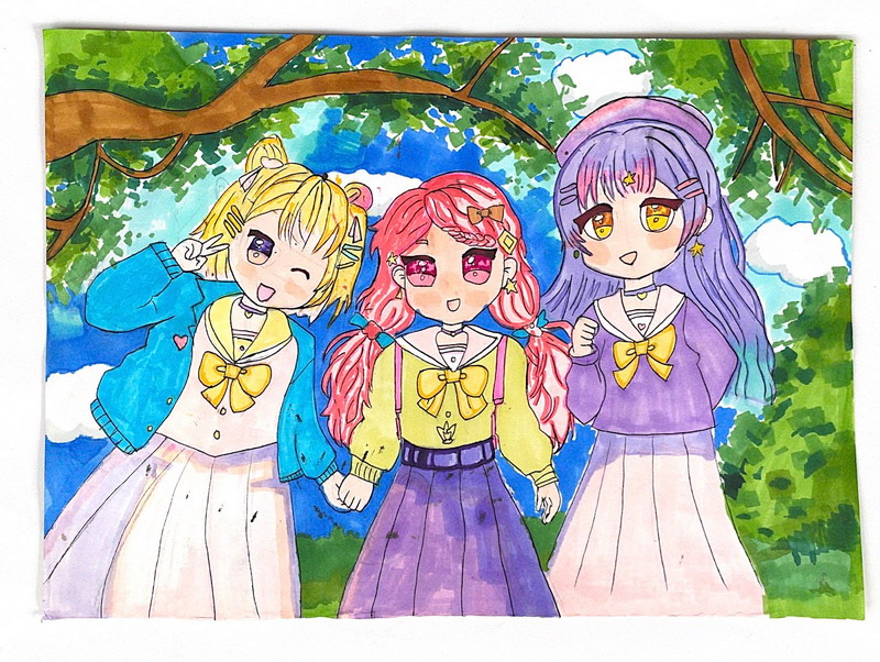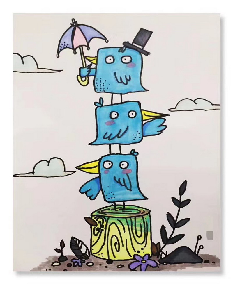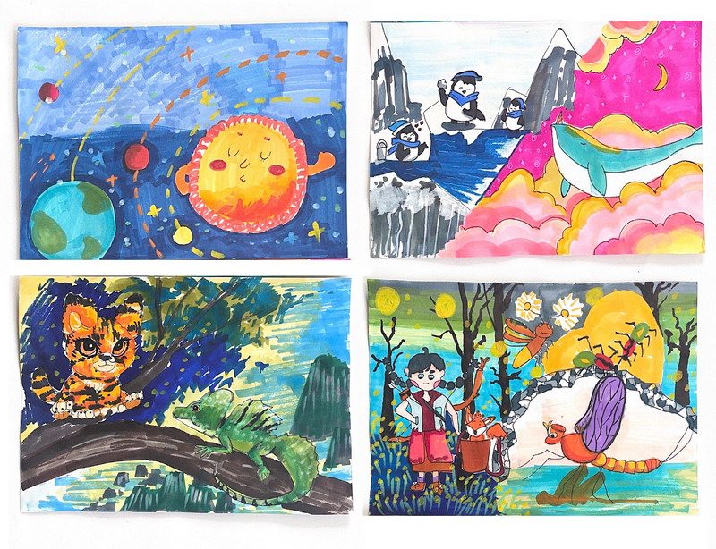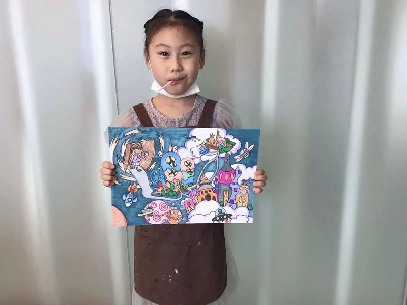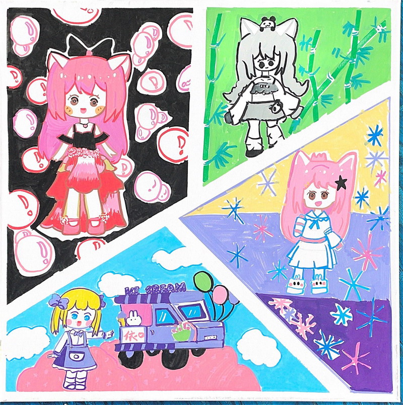 云邈說(shuō):她二年級(jí)就開(kāi)始學(xué)習(xí)國(guó)畫(huà),三年級(jí)學(xué)習(xí)漫畫(huà),后來(lái)又學(xué)習(xí)油畫(huà)。但隨著年紀(jì)增高,繪畫(huà)漸漸成了忙里偷閑的事。因此,這次展出的大部分畫(huà)作都是四年級(jí)以前的,顯得十分稚嫩?,F(xiàn)在,雖然學(xué)習(xí)壓力很大,但我還在堅(jiān)持繪畫(huà):有空時(shí)畫(huà)一些小插畫(huà),在學(xué)校幫同學(xué)畫(huà)黑板報(bào),等等。幾天前,我還找到了我幼兒園時(shí)的畫(huà),雖然對(duì)于現(xiàn)在的我不忍直視,但這也算是一種熱愛(ài)呢!