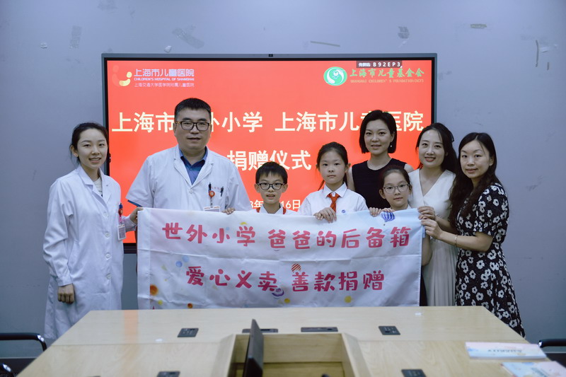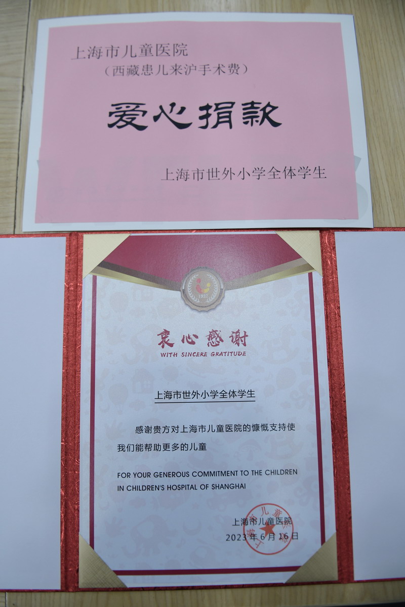 6月16日,“爸爸的后備箱”愛心善款的剩余部分捐獻給了西藏來滬醫治的兒童。三年級部分小朋友和家長代表帶著“六一”義賣部分善款來到上海兒童醫院進行捐獻。兩年前,先天性小耳畸形伴重度聽障的小群培幸運地成為了我們的幫扶對象,有了首次赴上海治療的機遇。今年暑假,他即將進行第二次手術,這筆善款講幫助他繼續修復聽障,也是世外愛心的延續。希望這些善款能真正幫助到西藏小伙伴,愿我們的心同頻共振,愿我們一起奔跑在陽光下。