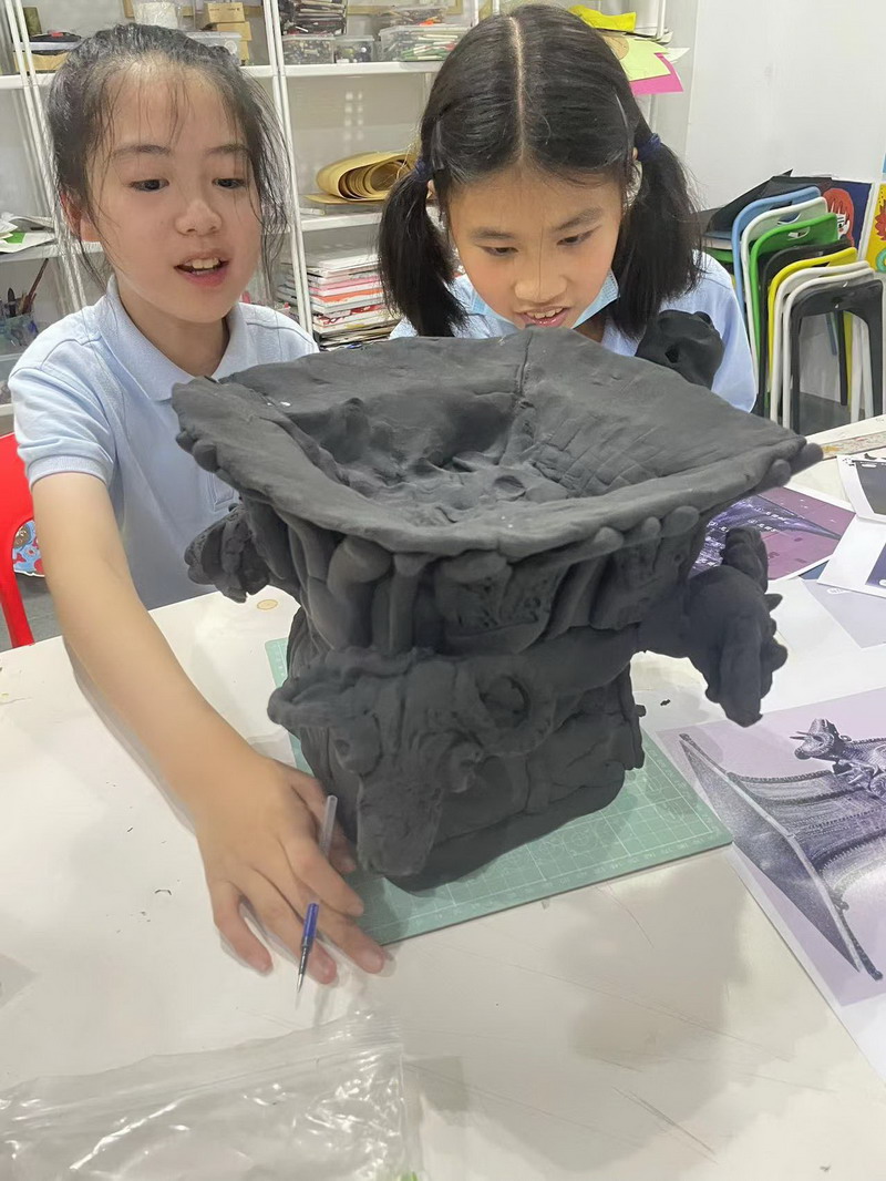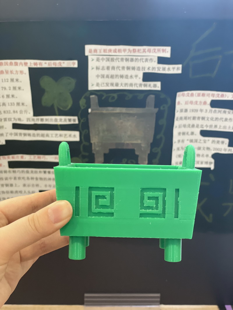 定好展品,那用什么材料來制作呢?這可難不倒我們,課上雖然只學習了用泥塑復原展品,但孩子們的創意可不止這些。陶泥、紙雕、杯子、餐盒……在他們的手里,一切材料都能運用。平時DT課、電腦課學到的技術也都游刃有余。于是,3D打印、3DMAX建模等意想不到的技術也出現在展廳。