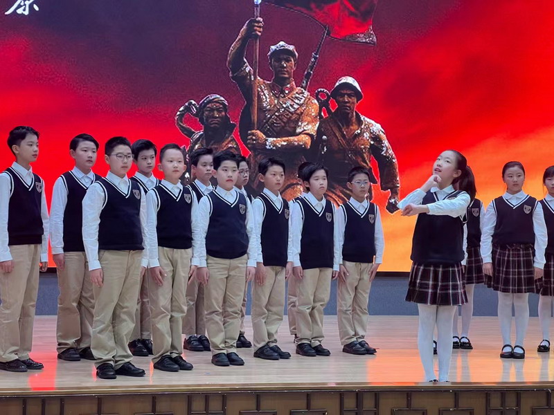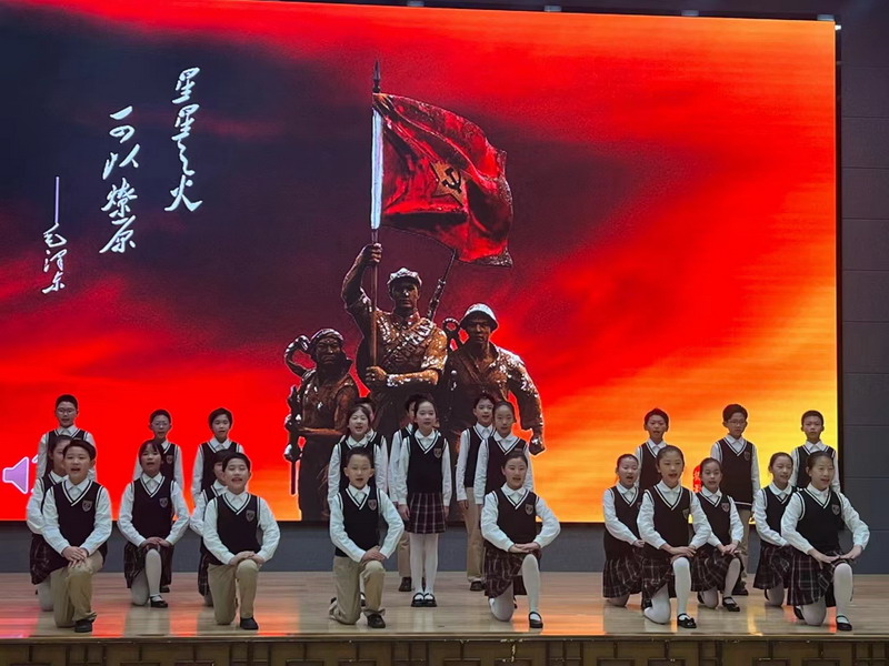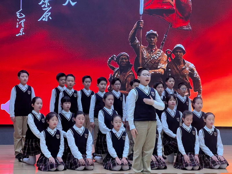 毛澤東詩詞是中國詩林中矗立的一株參天大樹,是一部中國革命的壯麗史詩。四年級的少先隊員們則聲情并茂地朗誦出《卜算子·詠梅》《沁園春·雪》《沁園春·長沙》三首毛澤東的經典詩詞,用他們鏗鏘有力的聲音帶領大家再次感受老一輩無產階級革命家自強不息、樂觀豪邁的革命精神。
