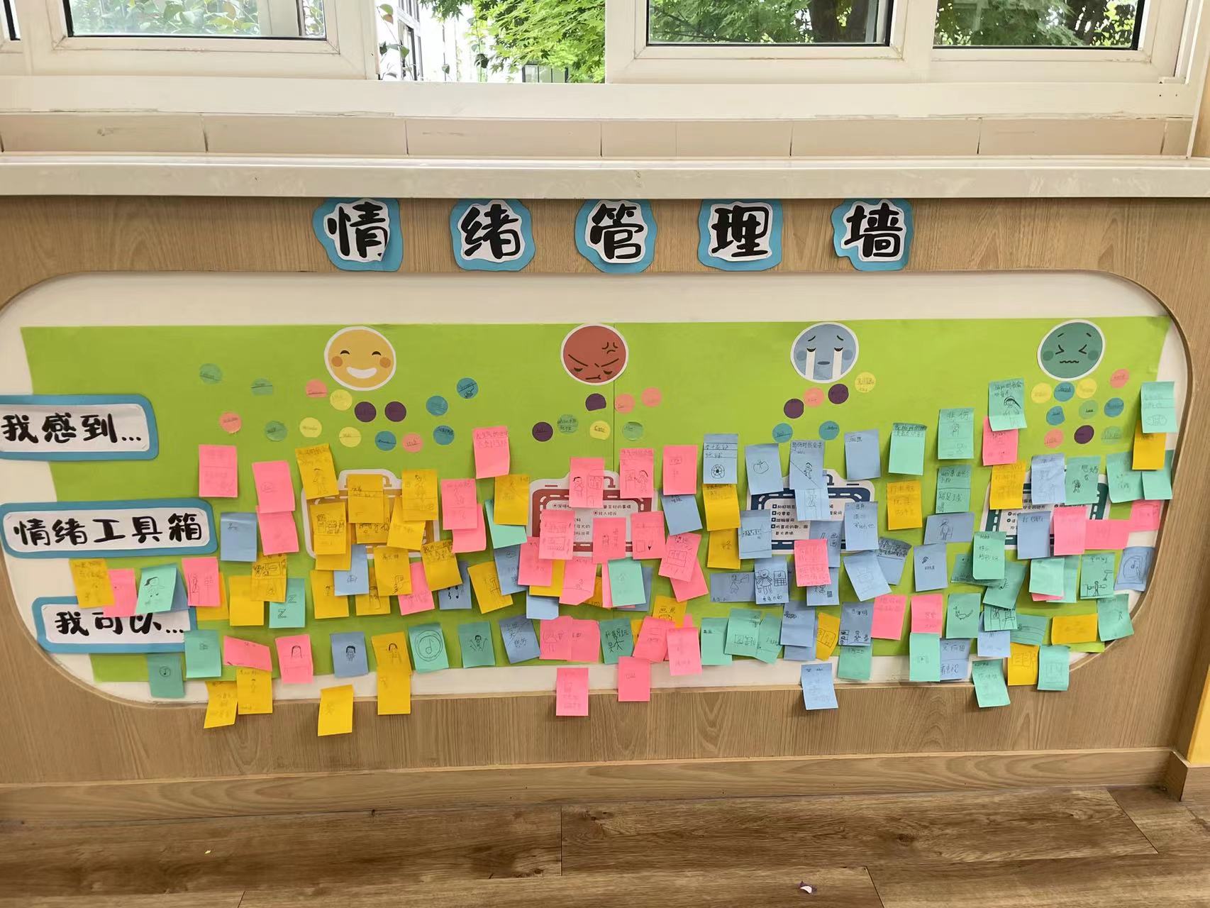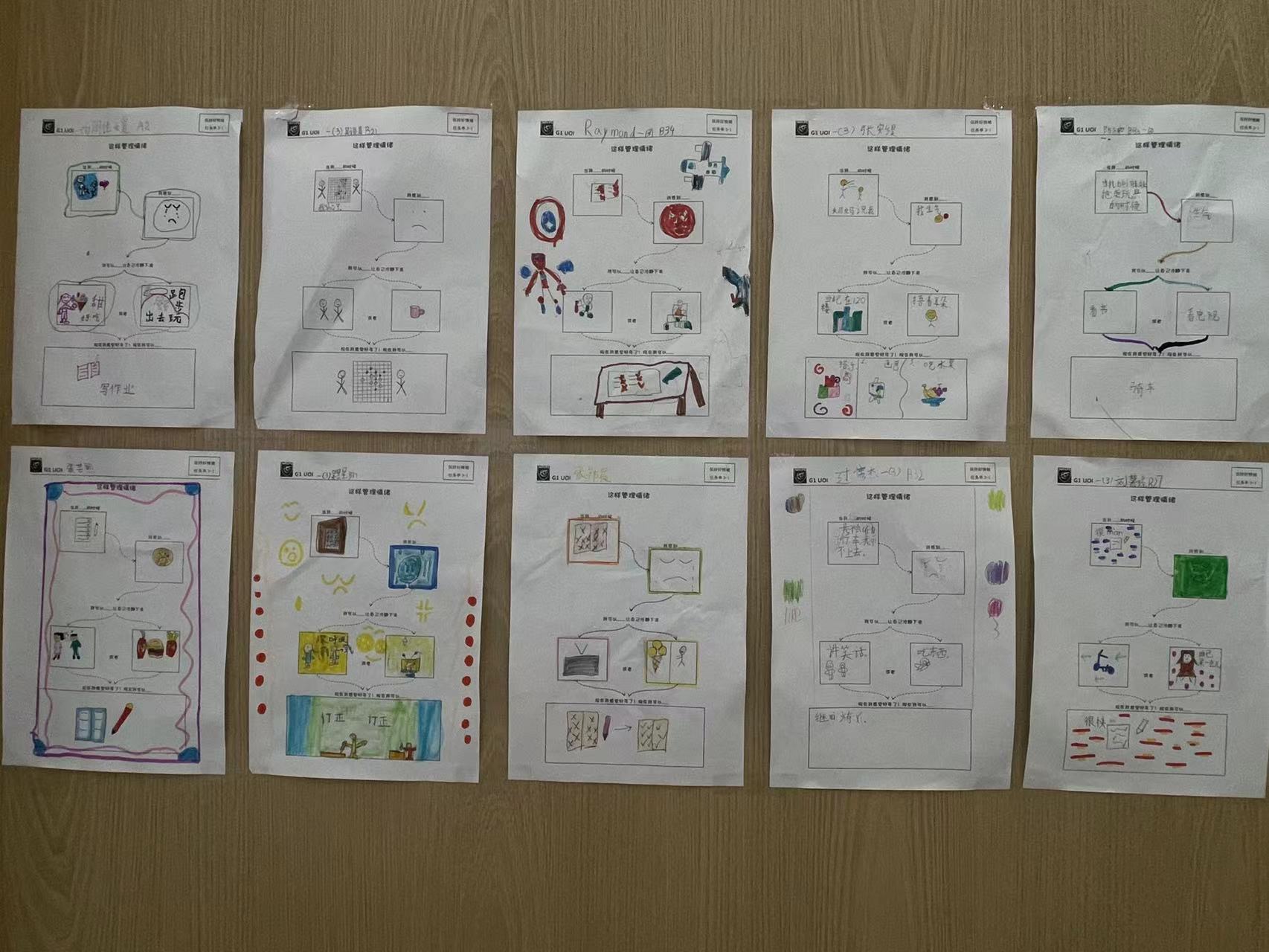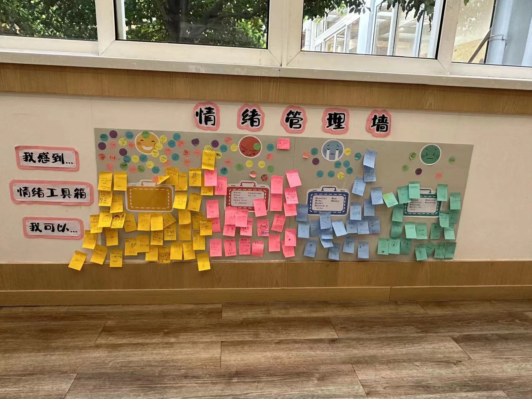 在討論、梳理了情緒管理的步驟,以及分享交流了各種有效的情緒管理策略后,學生們分別繪制了自己的情緒管理步驟圖,并在教室外共同布置了一面“情緒管理墻”。