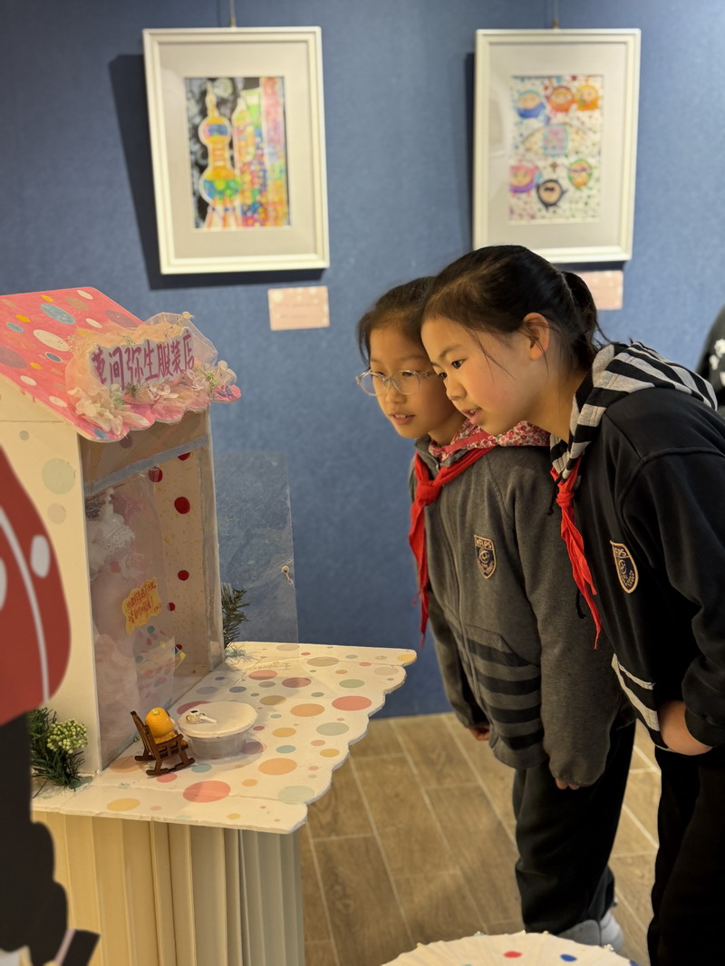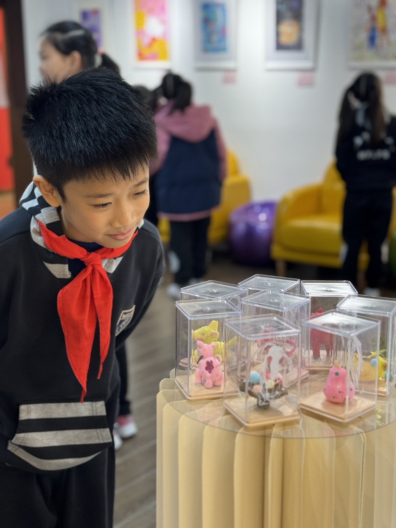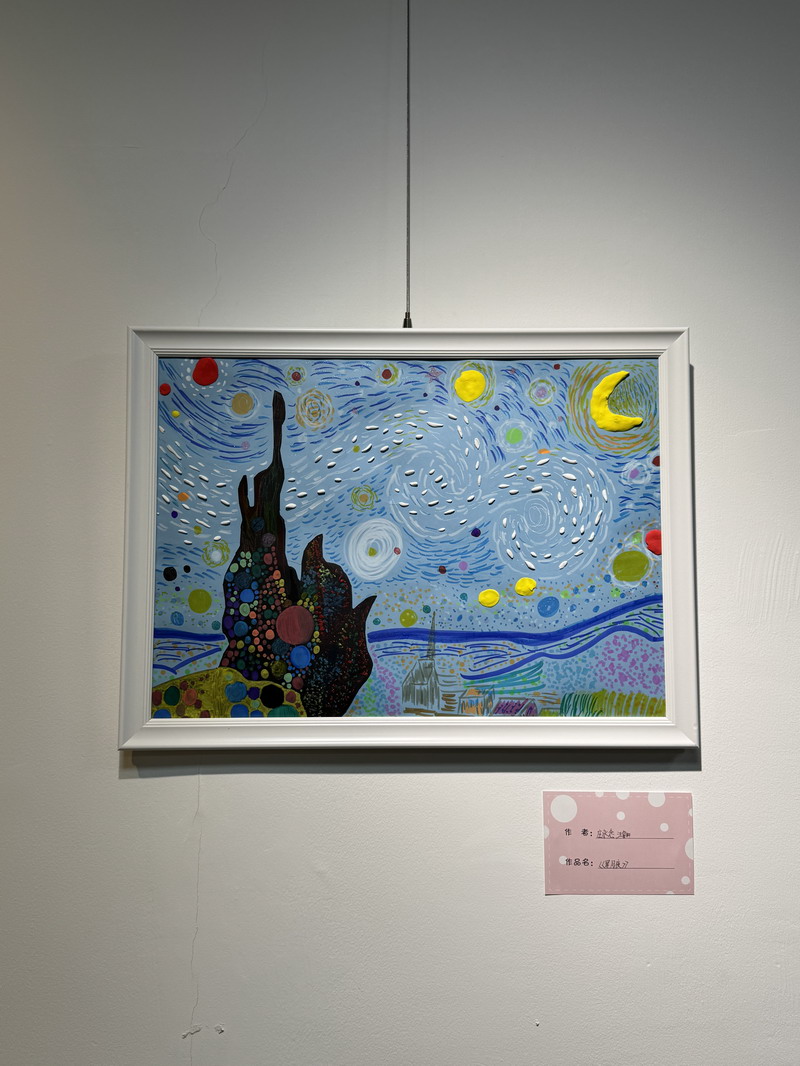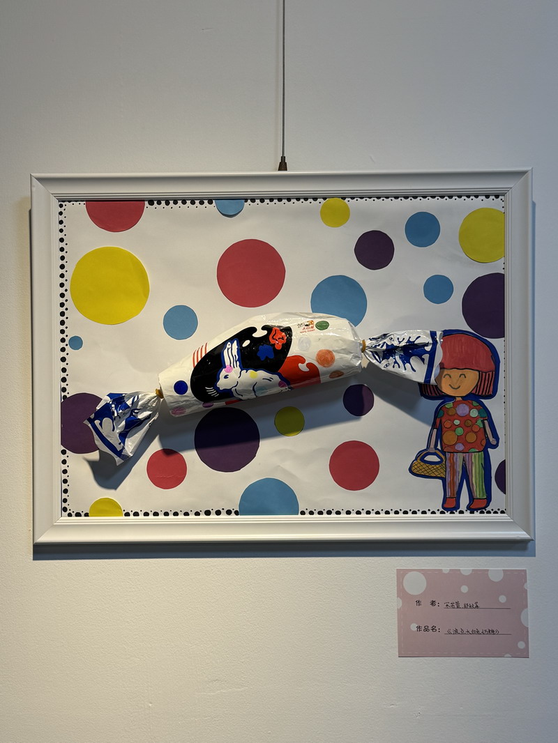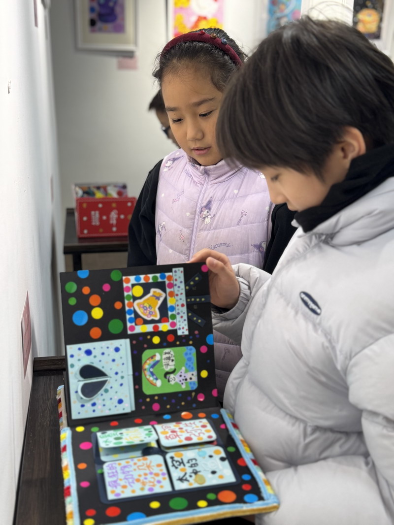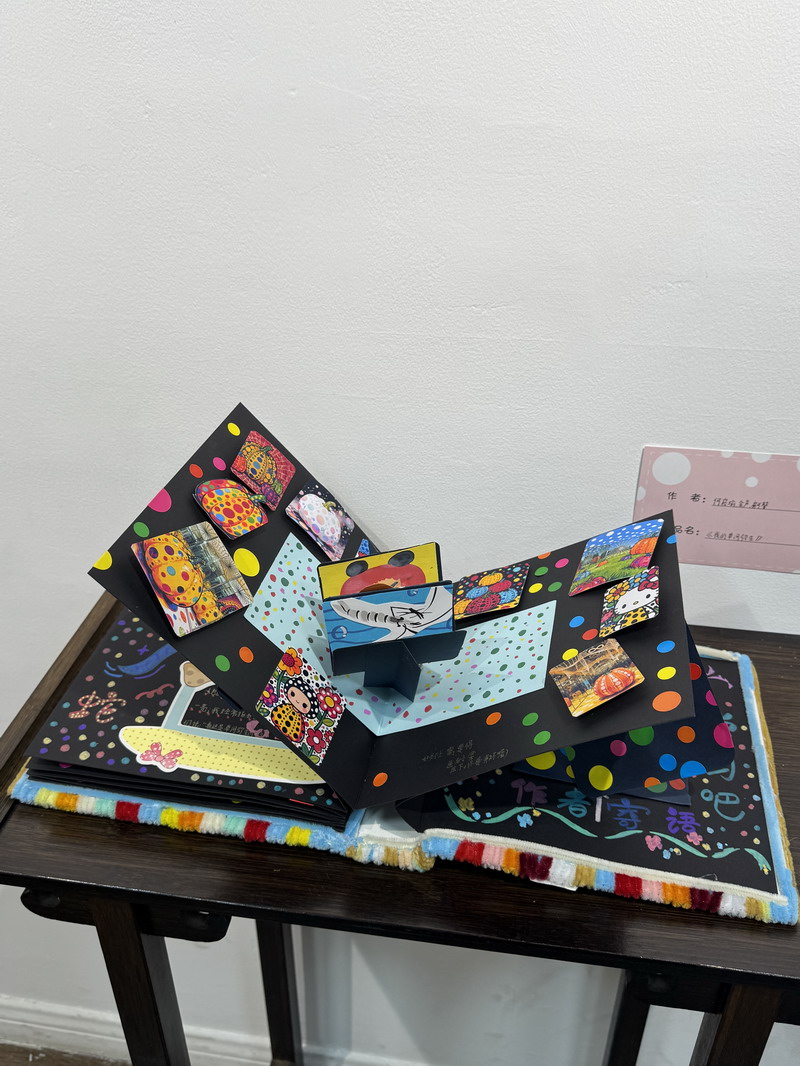 美術課上,自制圓規成為孩子們的創意工具。大家以圓為基礎元素,充分發揮想象力,勾勒出一幅幅充滿巧思的作品。展廳內,風格各異的作品令人目不暇接:部分同學借助AI工具提取靈感,將圓與星空、花海、童話世界結合,色彩斑斕的畫作中,圓形元素或為星辰、或為花瓣,層次豐富又富有意境;立體書作品格外吸睛,孩子們通過剪貼、折疊等手法,讓圓形圖案在書頁翻動間靈動呈現,有的展現四季更迭,有的講述趣味故事,將平面的圓轉化為立體的驚喜;彩泥作品則充滿童趣,孩子們用揉、捏、壓等技巧,將圓塑造成可愛的小動物、精致的花朵、美味的甜點,憨態可掬的造型盡顯童真。
