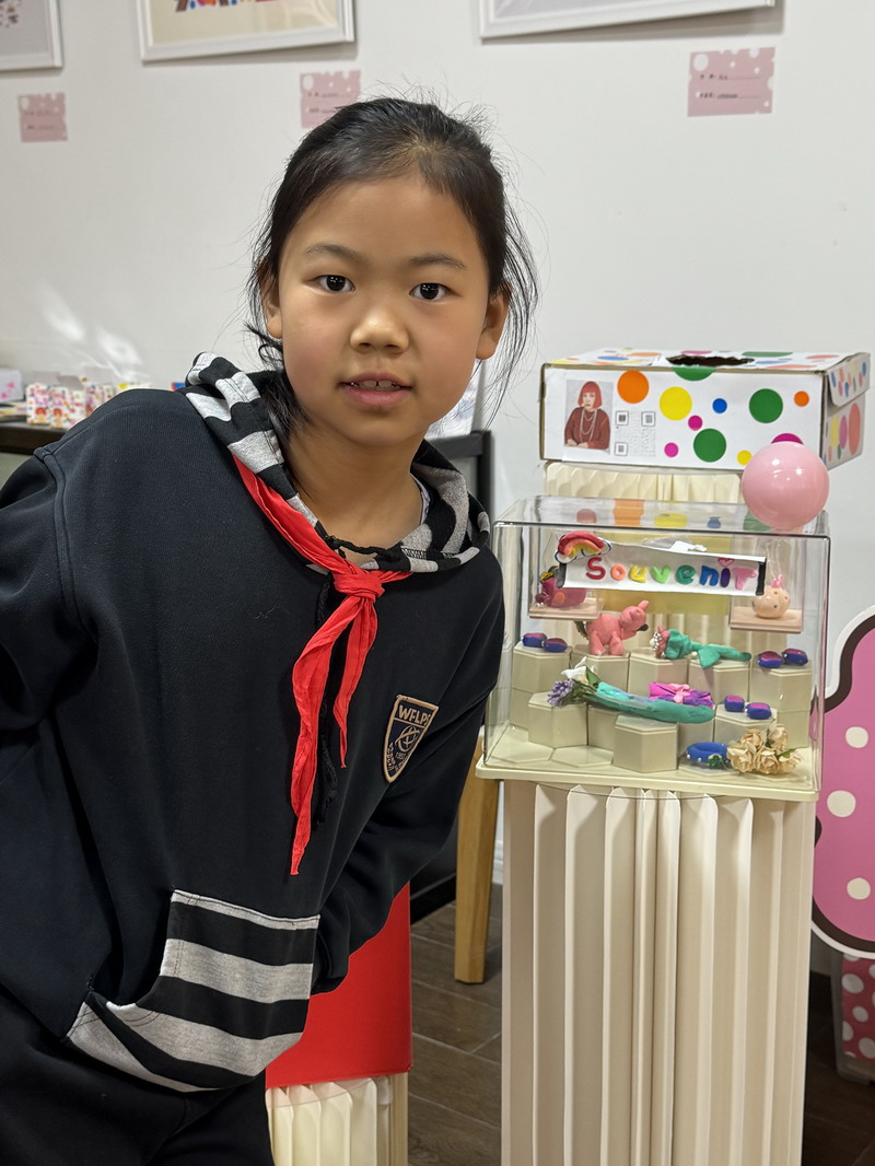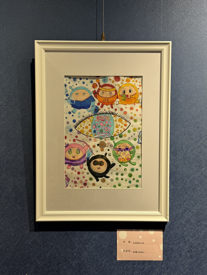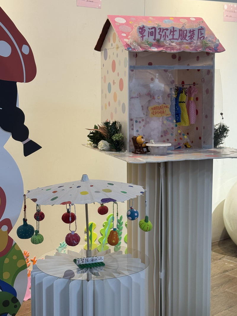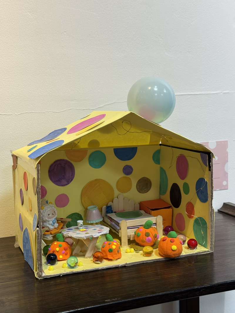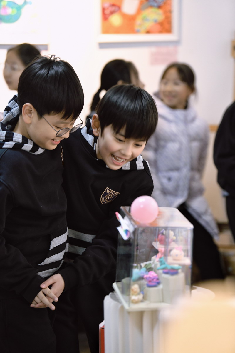 美術課上,自制圓規成為孩子們的創意工具。大家以圓為基礎元素,充分發揮想象力,勾勒出一幅幅充滿巧思的作品。展廳內,風格各異的作品令人目不暇接:部分同學借助AI工具提取靈感,將圓與星空、花海、童話世界結合,色彩斑斕的畫作中,圓形元素或為星辰、或為花瓣,層次豐富又富有意境;立體書作品格外吸睛,孩子們通過剪貼、折疊等手法,讓圓形圖案在書頁翻動間靈動呈現,有的展現四季更迭,有的講述趣味故事,將平面的圓轉化為立體的驚喜;彩泥作品則充滿童趣,孩子們用揉、捏、壓等技巧,將圓塑造成可愛的小動物、精致的花朵、美味的甜點,憨態可掬的造型盡顯童真。