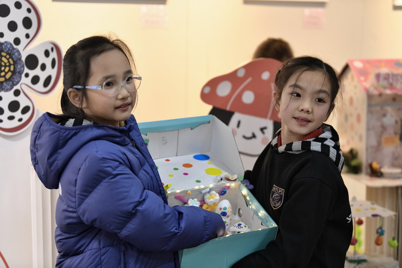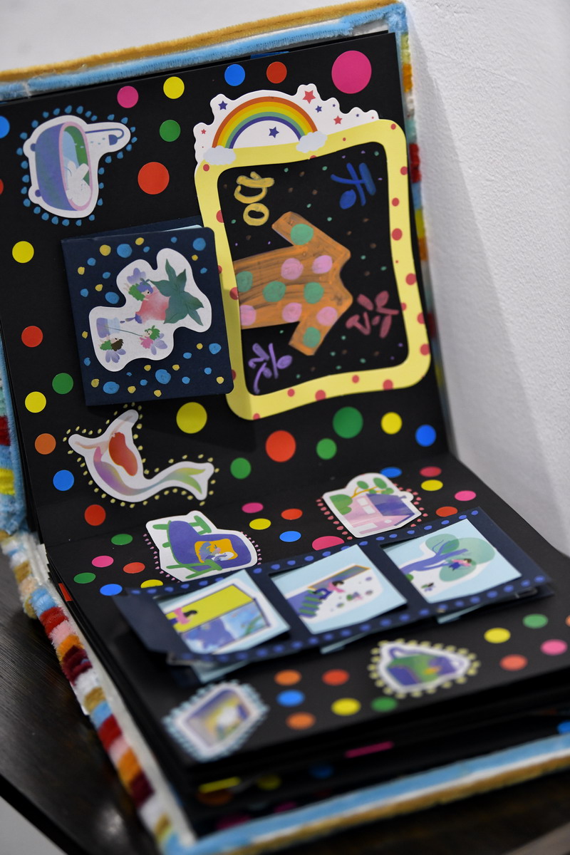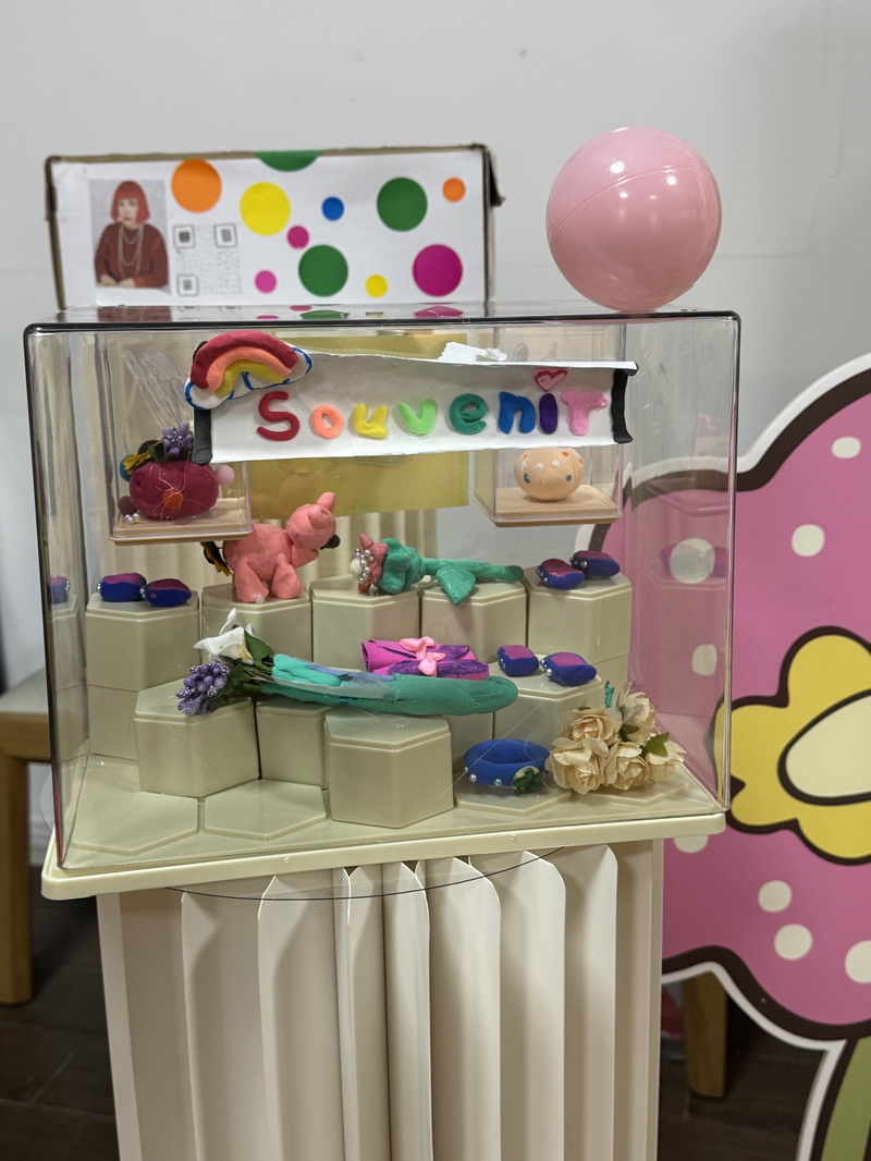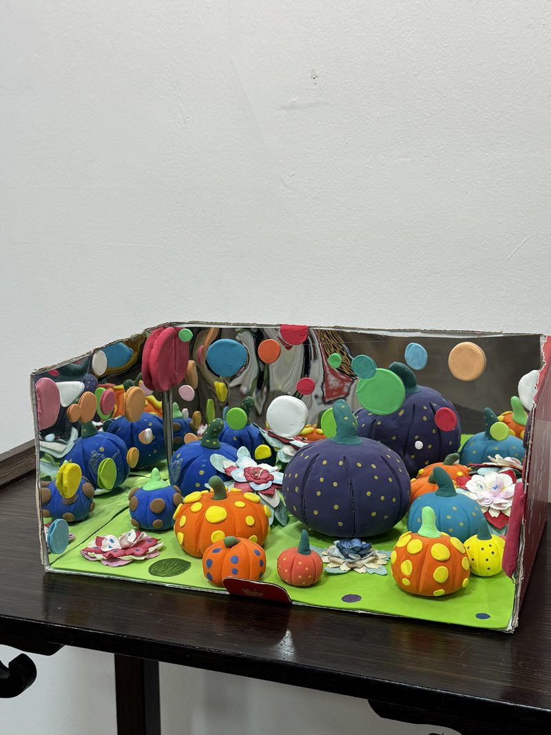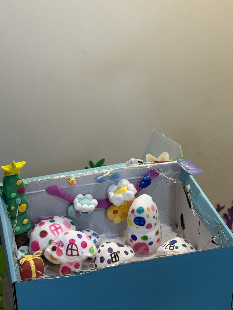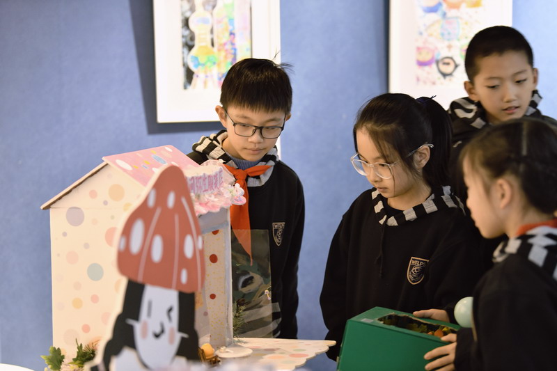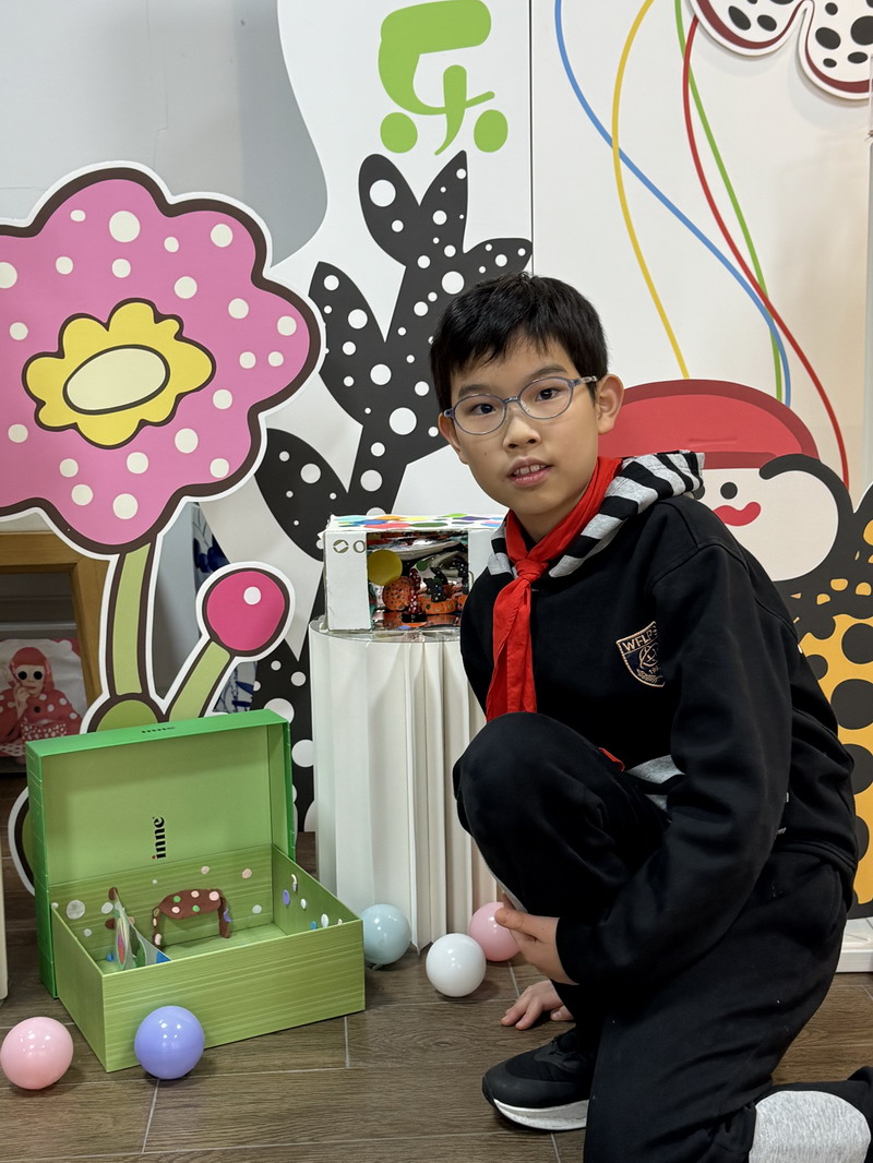 美術課上,自制圓規成為孩子們的創意工具。大家以圓為基礎元素,充分發揮想象力,勾勒出一幅幅充滿巧思的作品。展廳內,風格各異的作品令人目不暇接:部分同學借助AI工具提取靈感,將圓與星空、花海、童話世界結合,色彩斑斕的畫作中,圓形元素或為星辰、或為花瓣,層次豐富又富有意境;立體書作品格外吸睛,孩子們通過剪貼、折疊等手法,讓圓形圖案在書頁翻動間靈動呈現,有的展現四季更迭,有的講述趣味故事,將平面的圓轉化為立體的驚喜;彩泥作品則充滿童趣,孩子們用揉、捏、壓等技巧,將圓塑造成可愛的小動物、精致的花朵、美味的甜點,憨態可掬的造型盡顯童真。