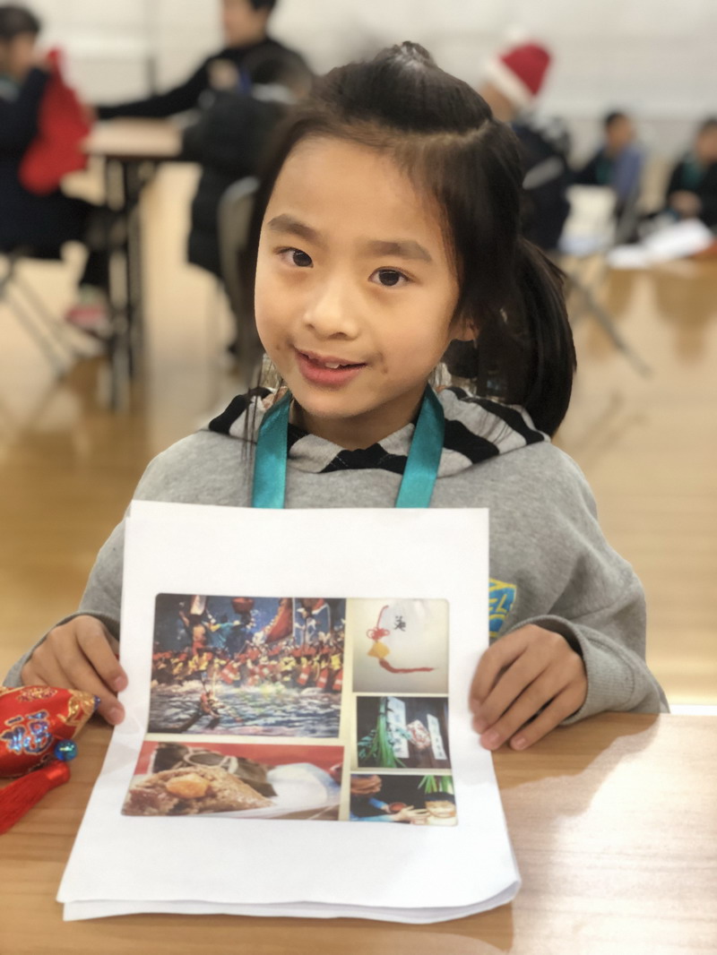 二年級的UOI單元與"節日"有關,孩子們選擇一個自己喜歡的節日進行演講。他們還準備了一些和節日有關的小物品。如與"圣誕節"有關的圣誕帽、與端午節有關的粽子、與臘八節有關的臘八粥等等。這些小道具使他們的演講更為生動。
