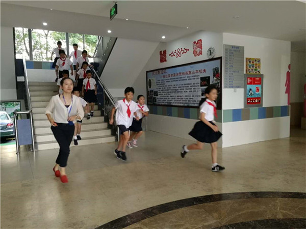 只聽空襲警報聲響起,五年級師生迅速從教學樓的五樓教室撤離,在撤離過程中做到迅速、及時、有序、不慌。如果是真實的情況,那么大家應該撤離到相應的防空洞進行躲避,而目前學校只有操場,所以作為演習,學生們就撤離到操場。到達操場之后,每位學生報數,班長進行清點人數,之后向班主任報告,班主任再向年級組長報告學生和教職工的人數,最后年級組織向大隊輔導員老師進行報告。僅僅一分多鐘的時間就完成了整個流程。