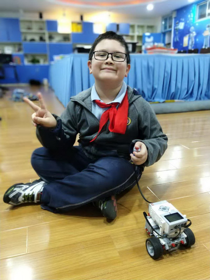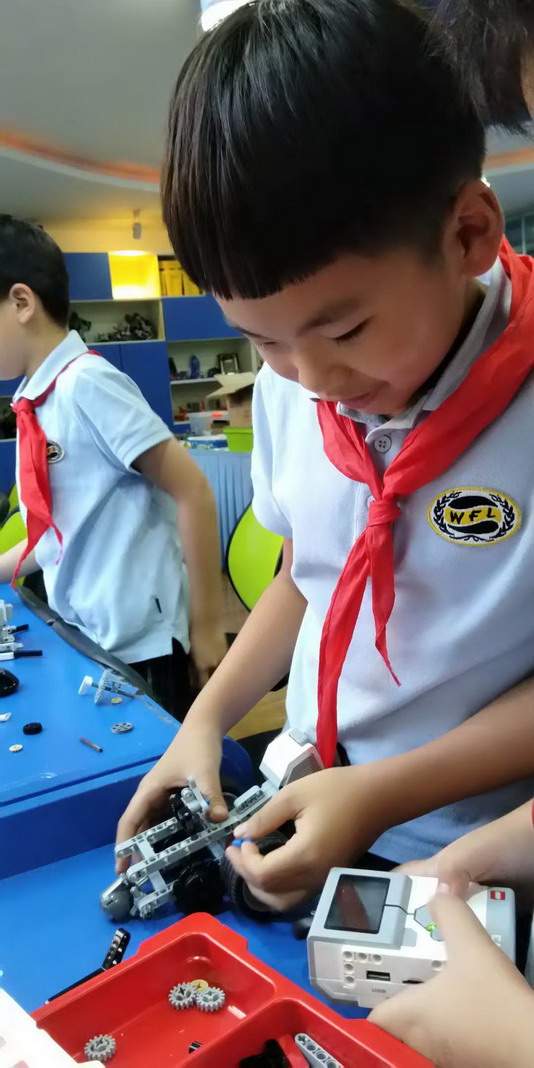 這些孩子來自世外小學雙語部的機器人社團,是從三年級新招收的零基礎的學生,每周一次的學習時間雖然短暫,但孩子們已經被編程機器人深深的吸引住了。孩子是天生的學習者,同時也是天生愛玩的,在"玩"的過程中,孩子們探索、體會屬于他們的世界,掌握更多的知識,充滿了滿足感和自信心,即使比賽失敗還是笑容滿面。