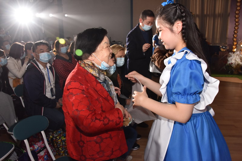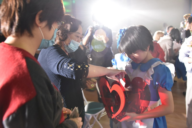 今天,體育館被布置成了郁郁蔥蔥、繁花似錦的森林仙境,主人公愛麗絲剪影投射在四壁上。舞臺上,每一句臺詞都原汁原味,每一個角色都妙趣橫生,每一個孩子都展現出了非凡的表現力、滿滿的自信和創造力。畢業班的家長們一起加入并觀看了這場奇妙的夢幻之旅。演出結束后,笑聲、掌聲……愛的氛圍久久縈繞現場。手捧著愛心捐獻箱的孩子穿梭在觀眾席籌集公益資金,一元、十元……這些匯集的善款將為上海兒童醫院需要救治的兒童們獻上一份愛心。
