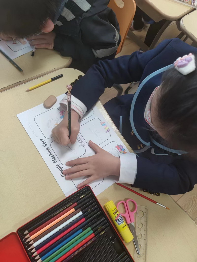 在本單元的學習中,一年級的孩子們認識了6種常見的簡單機械,即滑輪、杠桿、輪軸、楔子、斜面和螺旋。同時,他們還在老師的指導下完成了其中5種簡單機械的制作,當了一回小小機械工程師,實在是太了不起啦!