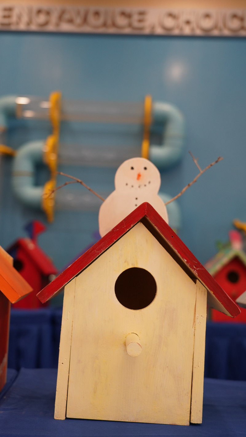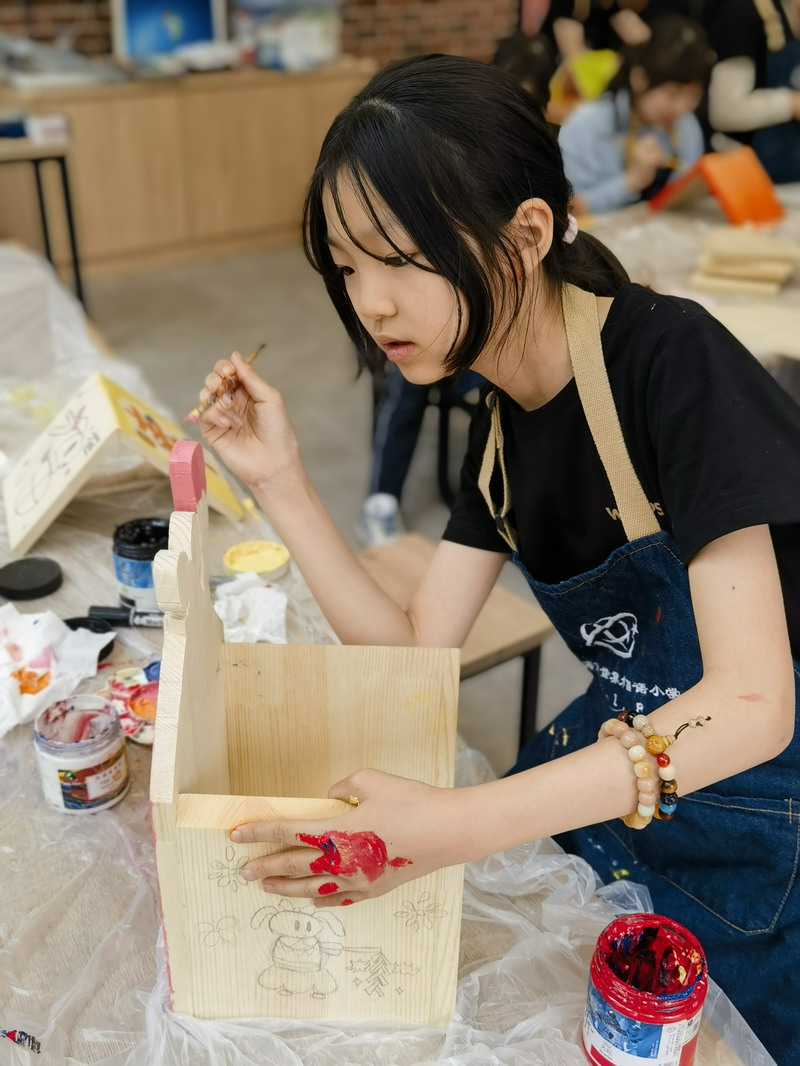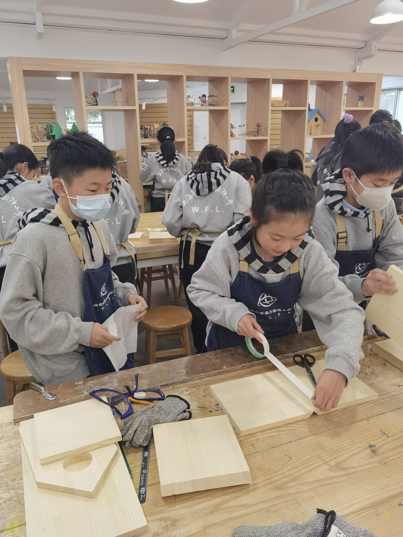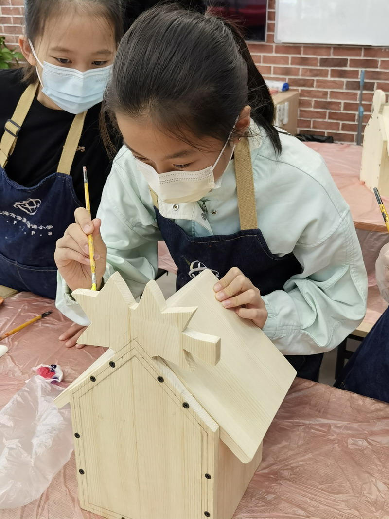 在打磨過程中,學生們仔細研磨每個木制零件,使其表面光滑平整,以便在組裝時更好地連接。最后,他們運用想象力和創造力,將鳥屋涂上豐富多彩的顏色,便于鳥兒們找到溫馨舒適的家。