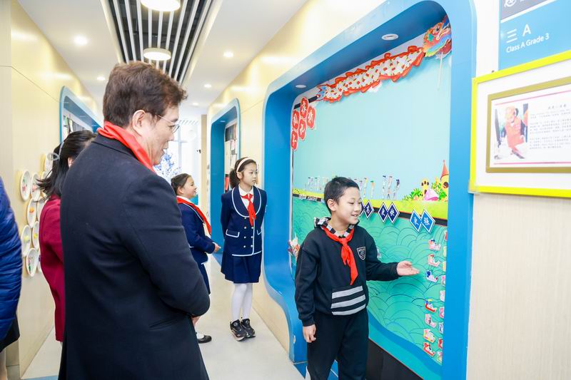 在講座之前,趙老師參觀了學校的閱讀環境布置。各班教室的閱讀墻創意滿滿,同學們通過巧妙的設計,將自己的閱讀成果和數據,可視化地呈現在閱讀墻上。趙老師聆聽著同學們的介紹,被同學們熱愛閱讀的熱情所打動;翻閱著“爸爸的書架”,被爸爸們深情撰寫的推薦信和推薦書所吸引……