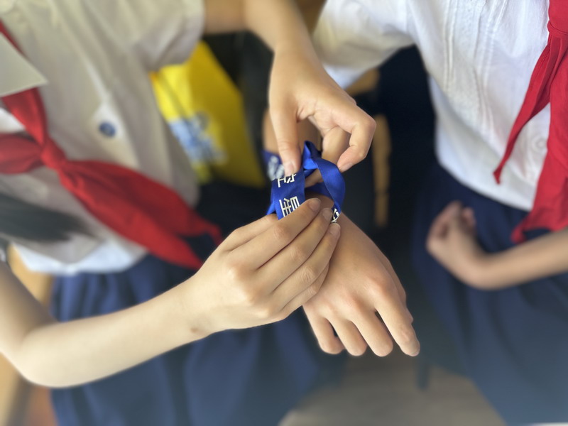 最后,同學們相聚會議室,和老師一起系上藍絲帶,共同承諾——“愛,讓星空藍起來”!
