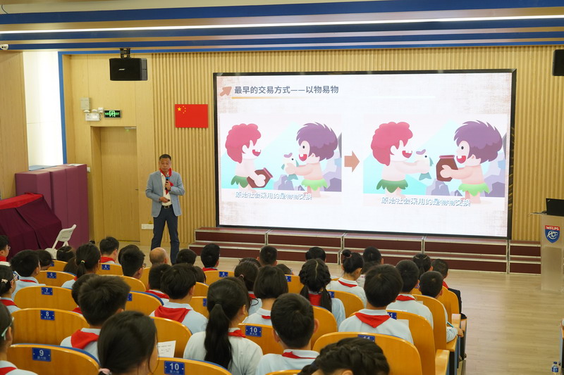 開幕式后,于爸爸為同學們帶來一場精彩的財商講座,他從貨幣起源,貿易發展等方面深入淺出地向同學們普及金融知識,也為之后的財商課程拉開了序幕。