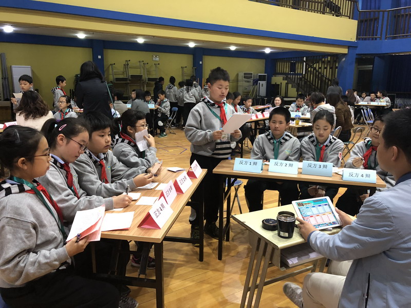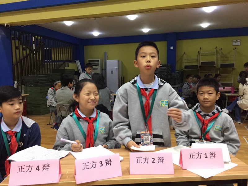 五年級的辯論賽盡管是第一次嘗試,但精彩紛呈的場面真是令人不容小覷,嘖嘖贊嘆。關于"一個三歲的孩子即將從高樓的窗臺上落下,作為一個十歲的你,是應該伸手去接?還是不接?"賽前,學生已拿到辯題,多日的準備工作中,他們在老師的指導下了解辯論方式;他們從正反兩方查找資料,準備論據;他們練習辯論技巧……孩子說,感覺自己這回真的是"腦袋里兩個小人在打架"。正式賽場上,學生隨機組合,抽簽決定正反方和辯論角色。辯場上,有的滔滔不絕,有的慢條斯理,有的大氣沉穩,有的睿智幽默。"伸手,是一種生理反應,是為人的本能。""兩害相權取其輕。""為拯救生命,我們可以作出任何的犧牲。""救人要有方,否則就是害人。"……各種論點,各種佐證,精彩萬分。每個孩子都有其豐富的內心世界和辨證的邏輯思維。今天,他們讓我們看見。