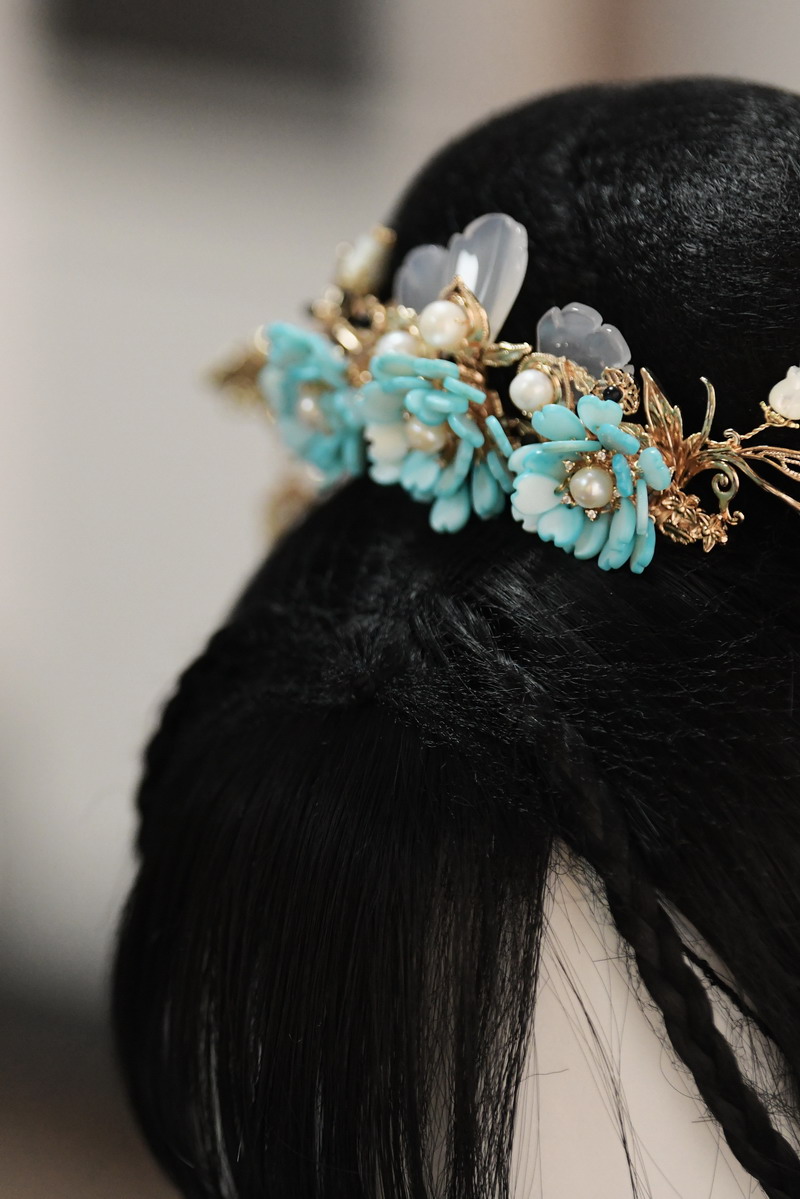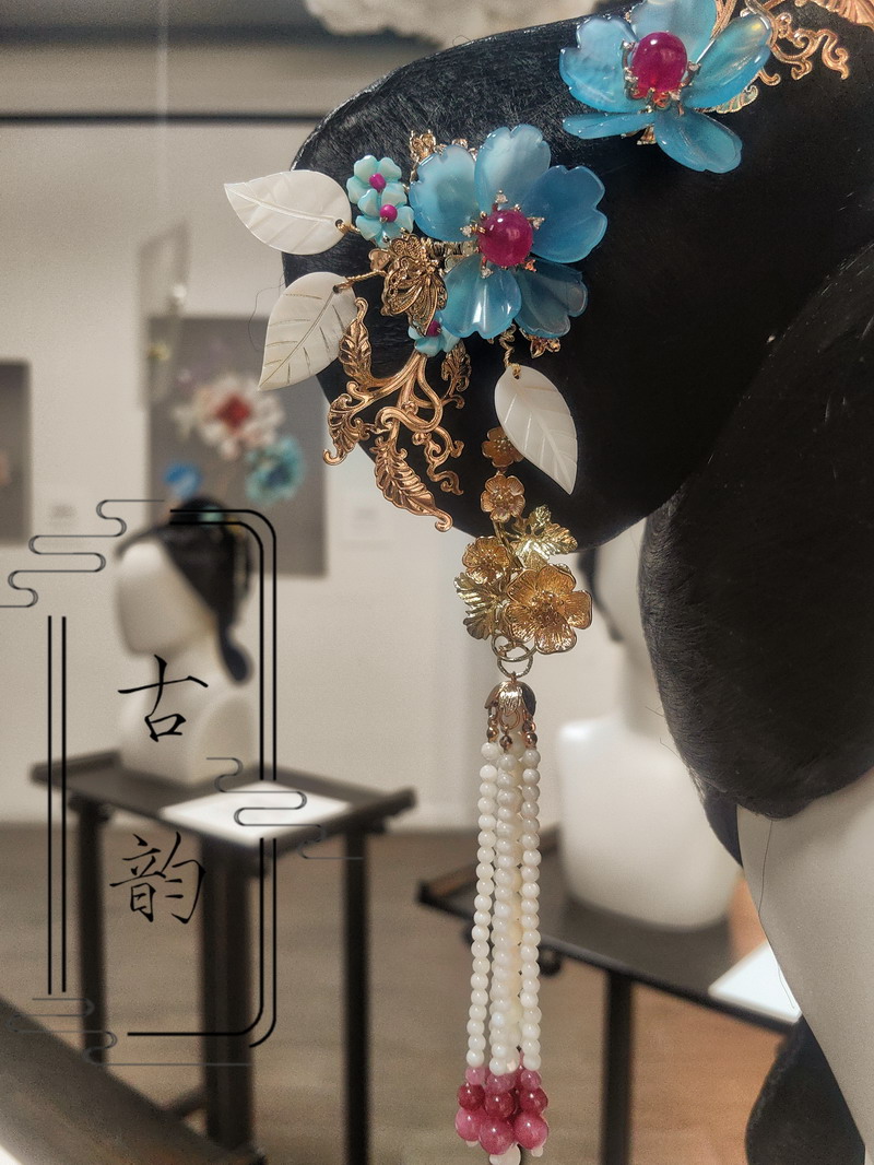 呂彥樺同學自幼熱愛手工制作,一次偶然看到“非遺里的中國”中故宮金銀首飾修復視頻,那精美的發簪如同一把鑰匙,開啟了她對非遺文化探索的大門。她深入查詢發簪技藝資料,從發簪、發釵、步搖到鳳冠,從纏花、絨花到花絲、點翠,被傳統首飾文化的魅力深深折服。